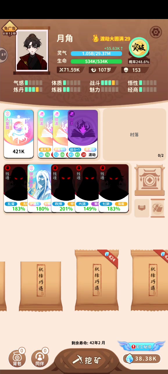 看广告后返回, 游戏在后台意外终止,重新进入后变成了图一,点击突破后变成了图二,最后查看修仙榜记录,竟然飞升三次。图四是飞升前截图。