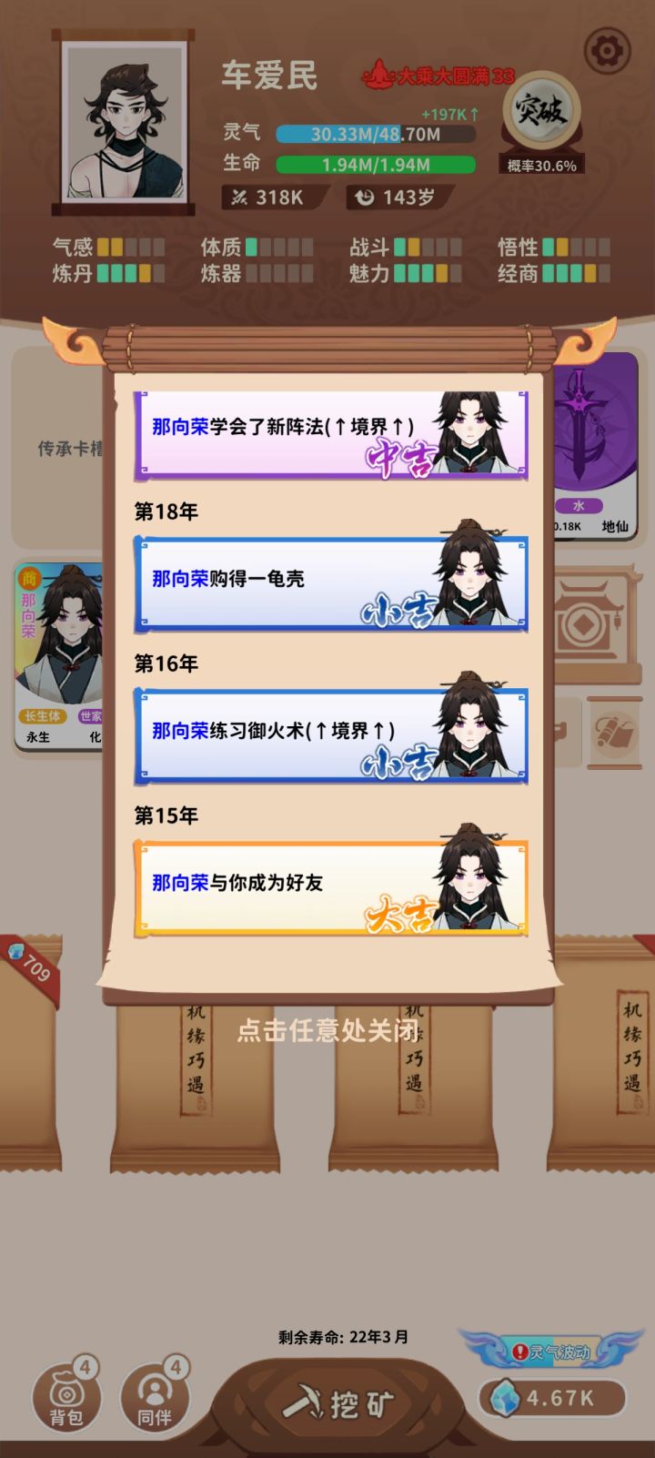 15岁结交了练气期的道友,一路跟着我从练气走到了化神,经过了22次境界提升,一直没有遇到自己的死劫,商贾出身,世家子弟,妥妥的主角模板啊,他的履历:21岁 炼丹炸炉38岁 神识受损42岁 炼器炸炉63岁 灵石被盗68岁 心魔87岁 灵石再次被盗118岁 武器爆了寿命用完之前我会一直看着这位道友能走到什么境界持续更新。。。。。