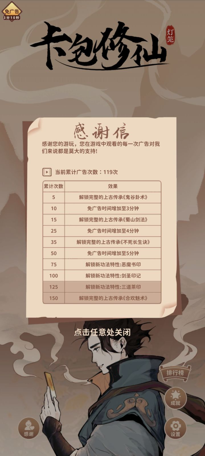 玩了大概五六天,看了23个广告,终于地仙了。