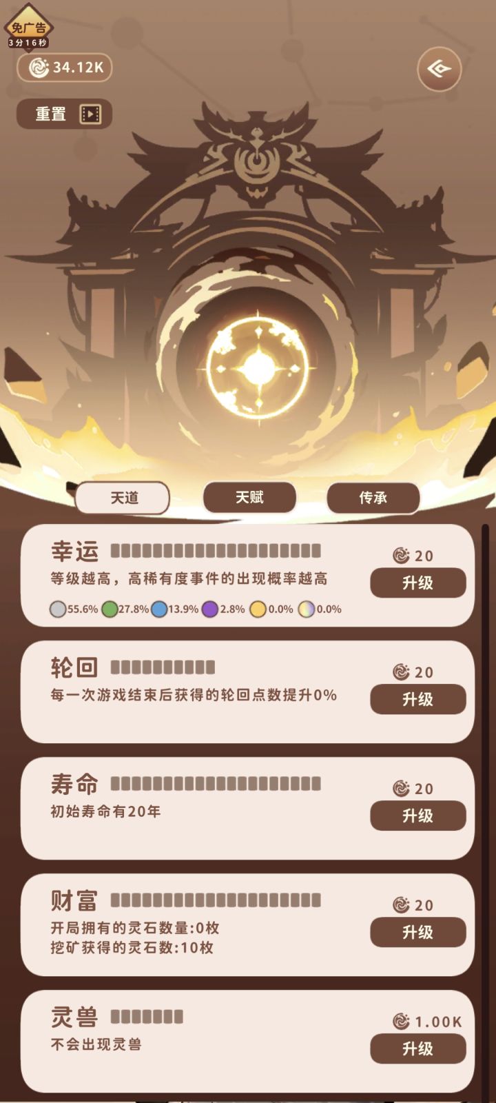 我才知道不同版本广告奖励不一样我这个应该是最拉的好像别的居然有10分钟免广告!但是重开的话我3万多轮回点就没了