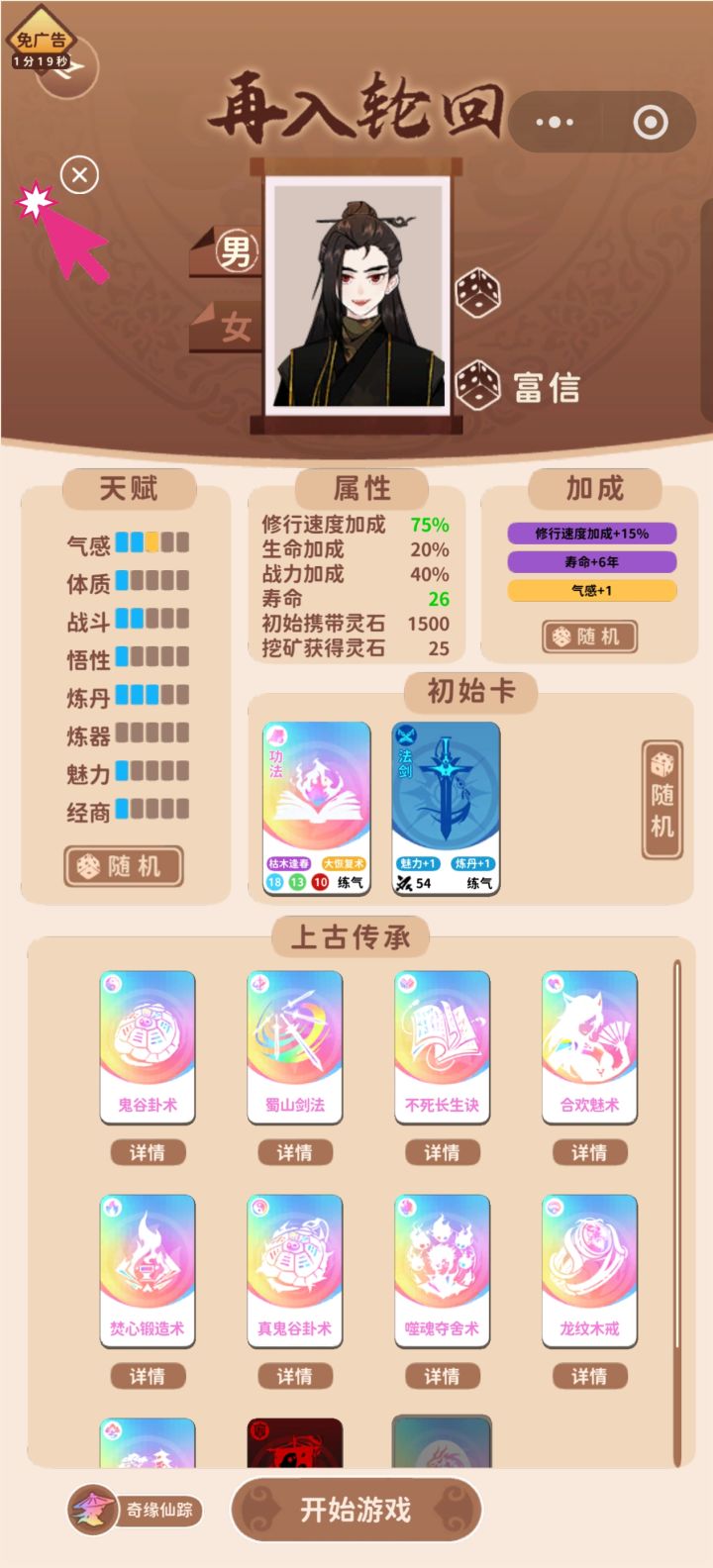 目前游戏内还有一个免广告兑换码(需自购) 不懂的你基本上都能在搜索框搜索到对应攻略传承选择 长生 夺舍 合欢(有一定轮回点基础后可以选)长生(新手开局唯一能成仙的流派,新手开局看一个广告试用即可)核心词条 大恢复术 枯木逢春(枯木逢春每个月回血大恢复术回血给灵气)奇缘选择 风灵希 随便思路 一直挖矿去盛会找两个核心词条,都找到之后还是挖矿除了盛会包不要买,进入社会购买突破丹以用于增加突破