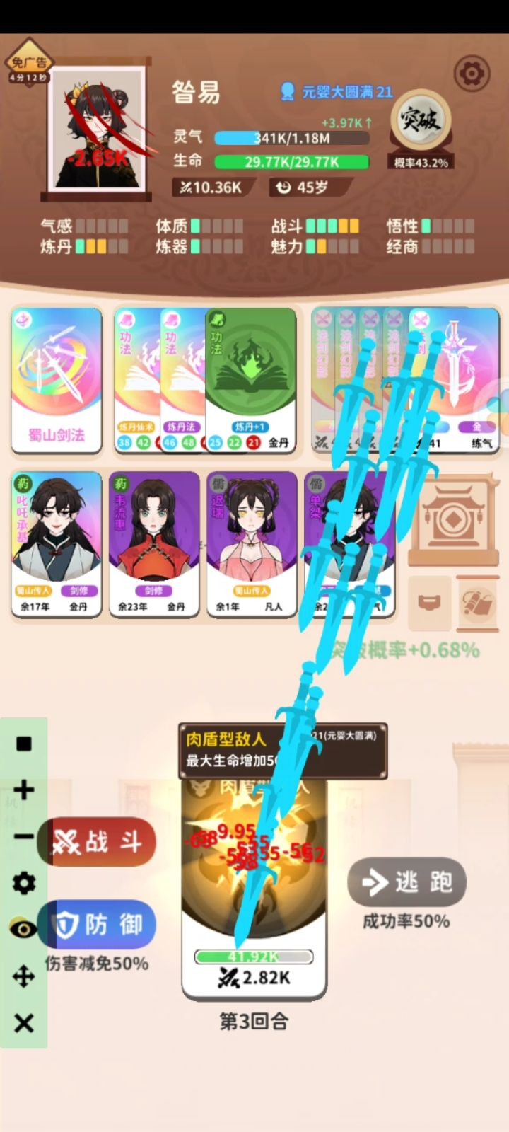 他们血量几10k,然后我伤害才50多点,别问我为什么攻击那么多,因为有两个,蜀山传人,再加上七彩水属性,打他们几乎不扣血,不过我是真没招了,找半天找不到大恢复,这样给多爽啊?我估计打一次就能提升修为了