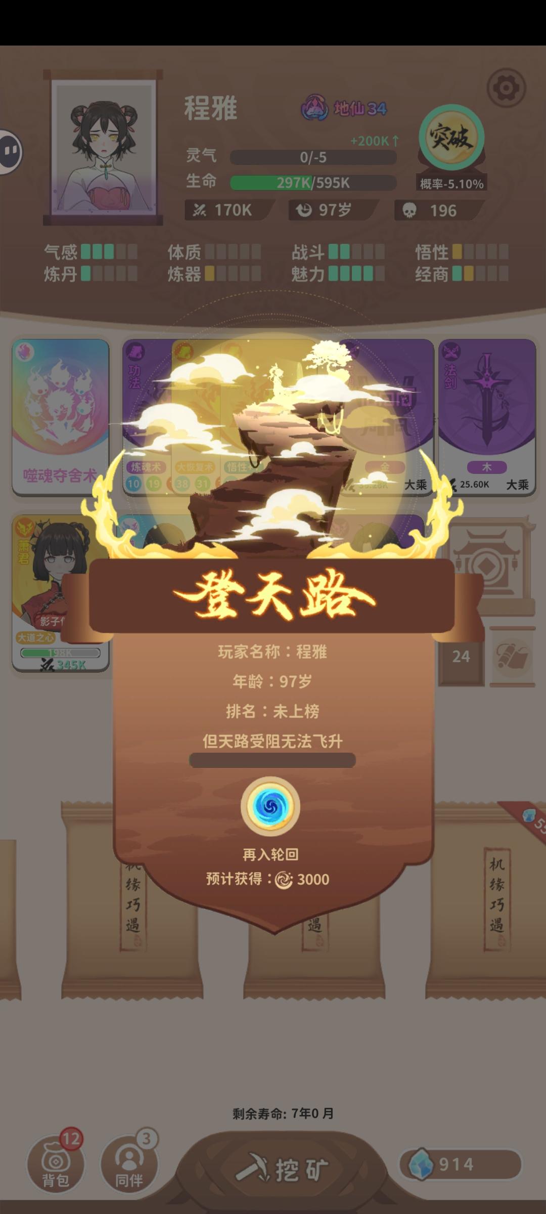 今天花了好几个小时,终于让我给挤上去了当然了,在这里也提一下冲榜心得。首先噬魂夺魄只需要两个属性,一是魅力,用于提高结交概率,二是悟性,用于刷到合适的功法,其中魅力>悟性。在本局开始之前,这两个属性至少要三以上。其次,开局最好刷一个遁术/御风而行+冰天雪地。遁术/御风而行很好理解,用于逃跑,噬魂夺魄等于自带-50%血上限,跟怪打很吃亏,所以为了速刷,一般选择拔腿就跑。至于