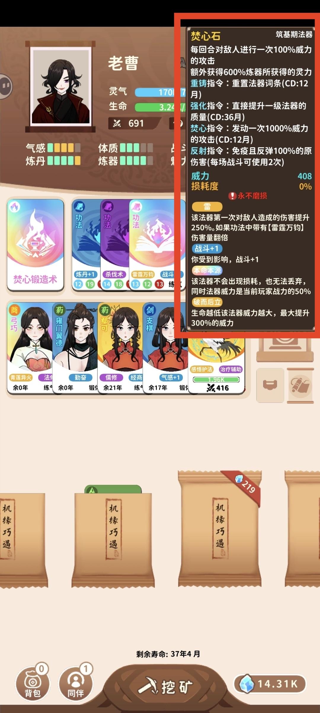 焚心锻造术伤害爆炸,简单粗暴。不过玩这个,有两大痛点。我感觉找到一点焚心锻造术的玩法了,特地来分享一下。第一,不知道怎么升级本命法宝本命法宝靠吞噬其他法宝得经验值。从灰色不断升级,灰色→绿色→蓝色→紫色→金色→彩色。升级法宝时的最后一件武器类型和词条,将会决定本命法宝的类型和词条。最后到彩色(金→彩)固定本命法宝类型,不再变化。本命法宝类型有四种:剑,鼎,镜,石。(1)剑:升级时吞