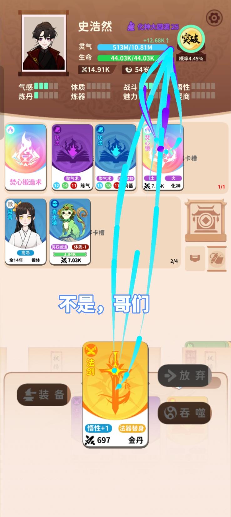 一个有点用但不多的bug,正常进商会买东西给焚心境吞,但是点吞噬了,剑却没消失能一直点刷了10分钟从元婴后期冲到了化神圆满,还有513M,不过突破概率太低了也没什么大用,也不怎道怎么触发的,#有知道的大佬可以分享一下