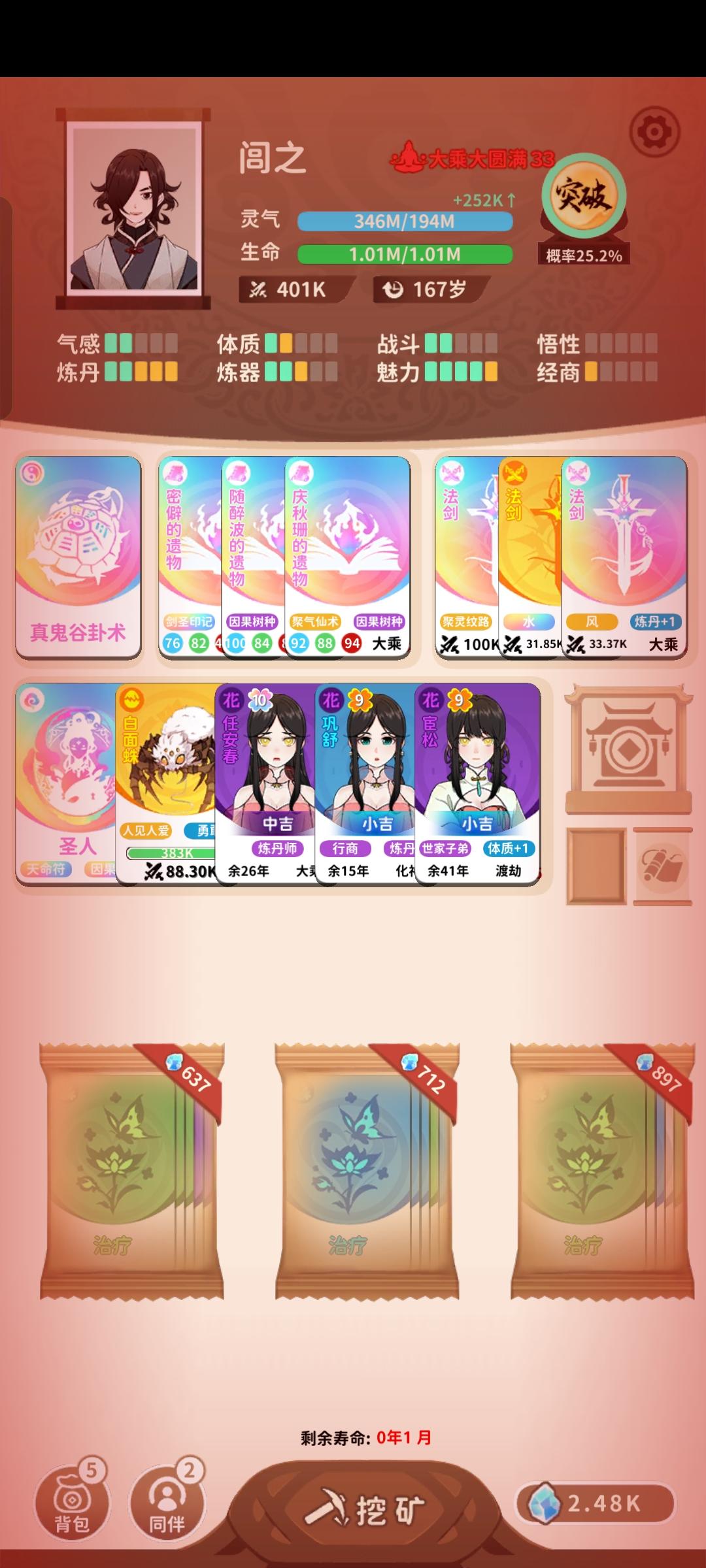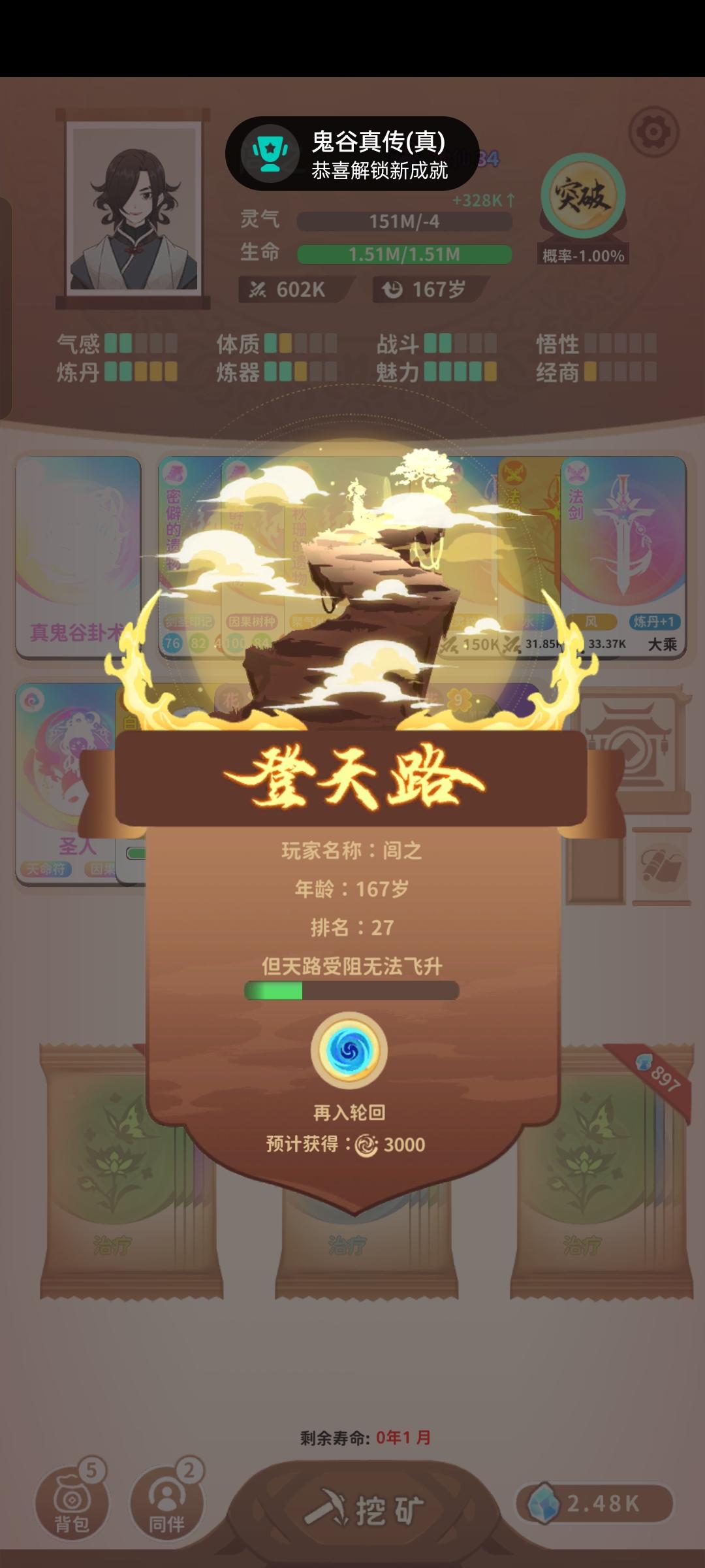 全成就拿下,最麻烦的就是登天路了,纯磨时间🥲其次是那个狐狸宠物,毕竟目前版本宠物用处非常小,单独去刷就是浪费时间,平时点又污染卡池,最后是搞了个长生,刷了快一千岁。简单说一下游戏,其实重要的就两条,灵气和突破概率,每种传承就是一个职业,能解决突破概率就想办法凑灵气(气感,实际上灵气根本不是问题,不考虑上榜的话),能有大量灵气供应的就凑突破概率(炼丹,药王谷,雨润万物,入土为安),套路都大同小异