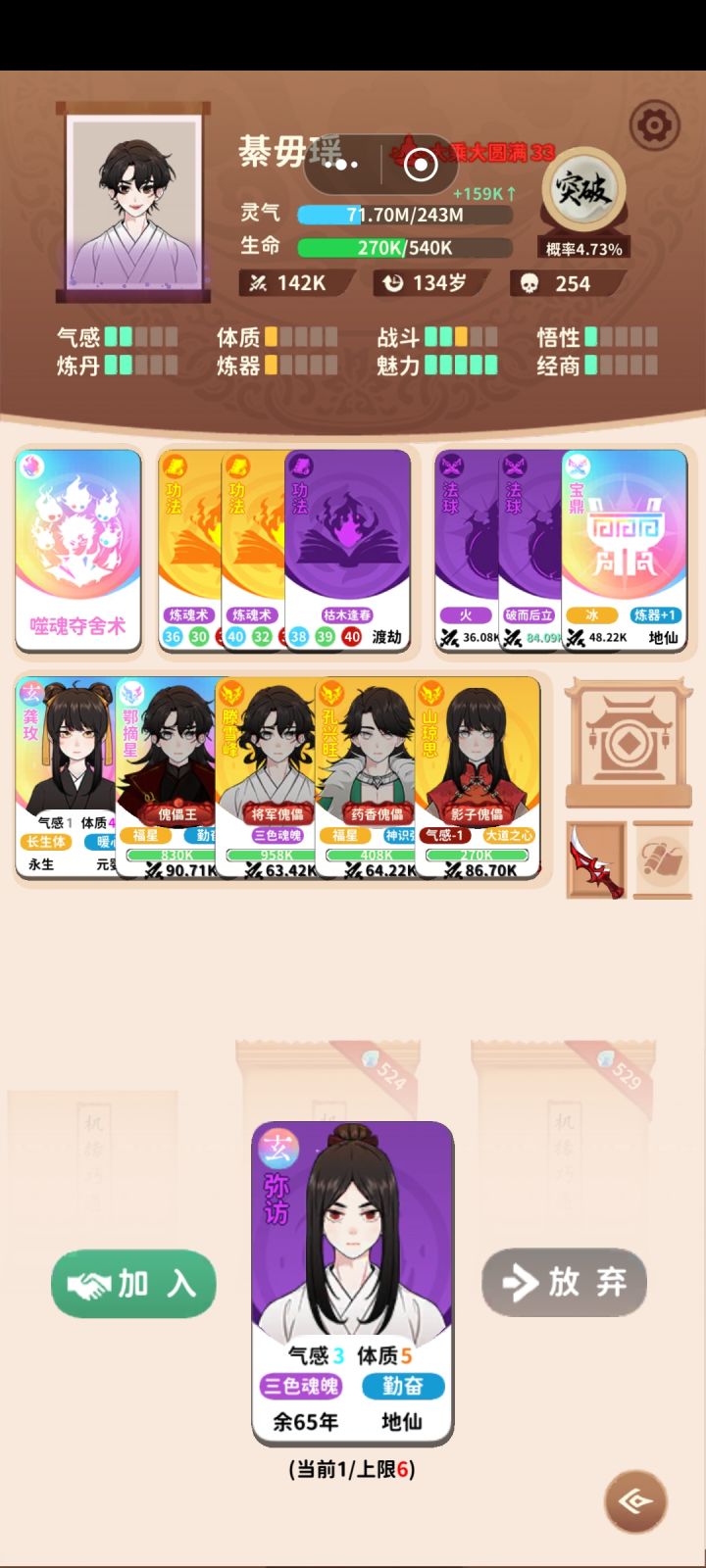 建议先看完真鬼谷卦术攻略。 传承要选真鬼谷卦术,刷魅力3~4点 伙伴刷新推荐如图二死劫(不用看气运)最好 伙伴卡左上角为气运,1点气运恶运次之 其他的运气什么的别要(这成就开局要让3个伙伴死然后就会变成魔道圣人)开局先不要突破等云谶子的第一次来 然后来到实力练气选择加一个伙伴(不喜欢看广告的可以不要)然后你的一点运气伙伴卡先不要丢 等他死加灵气(你有更好的伙伴品质,词条可丢,(粘人的