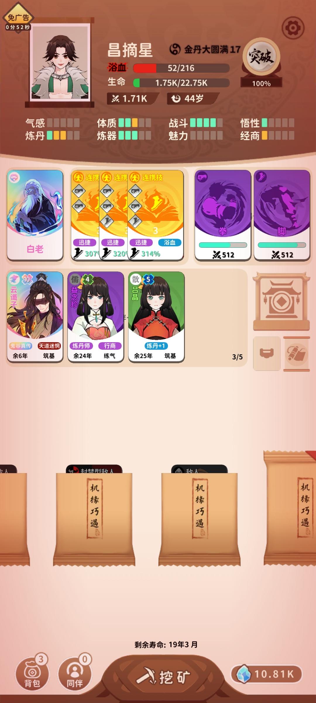 前期肯定要看广告把不死长生诀弄出来,弄出来了过后就需要刷轮回点了,怎么刷呢?开局前期先把宝阁调成10年内碰两次,前期有钱的情况下每个宝阁必须开找枯木逢春和恢复术或大恢复术,其他卡包一个也别点,只点宝阁,找到这两个后,后面宝阁只需要砍价拿突破丹就行几率80%再去突破(有更好的功法可以换,两个词条最顶搭配:恶魔书印+大恢复术或枯木逢春),武器词条要体质,武器会坏可要可不要,然后就是无限挖矿-宝阁-突破