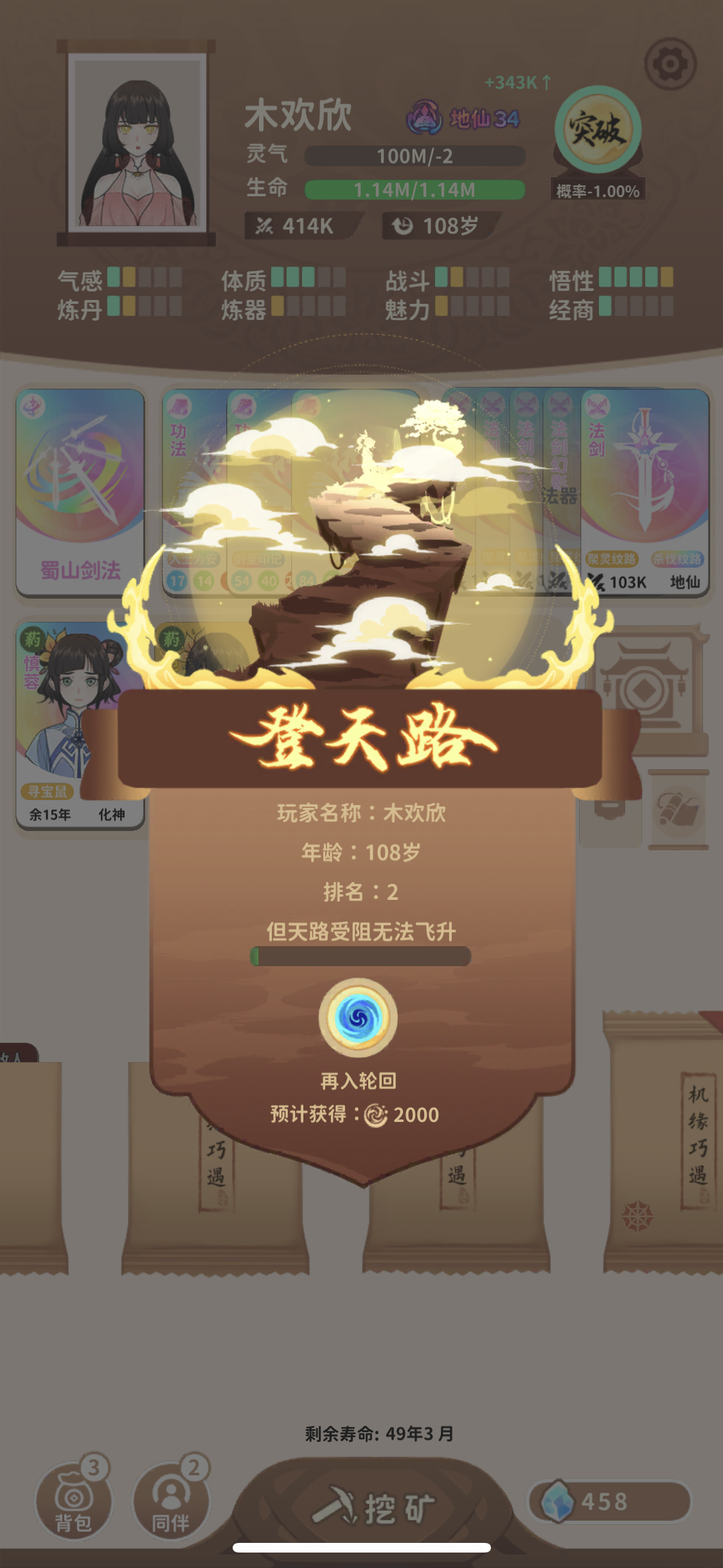 前期肯定要看广告把不死长生诀弄出来,弄出来了过后就需要刷轮回点了,怎么刷呢?开局前期先把宝阁调成10年内碰两次,前期有钱的情况下每个宝阁必须开找枯木逢春和恢复术或大恢复术,其他卡包一个也别点,只点宝阁,找到这两个后,后面宝阁只需要砍价拿突破丹就行几率80%再去突破(有更好的功法可以换,两个词条最顶搭配:恶魔书印+大恢复术或枯木逢春),武器词条要体质,武器会坏可要可不要,然后就是无限挖矿-宝阁-突破