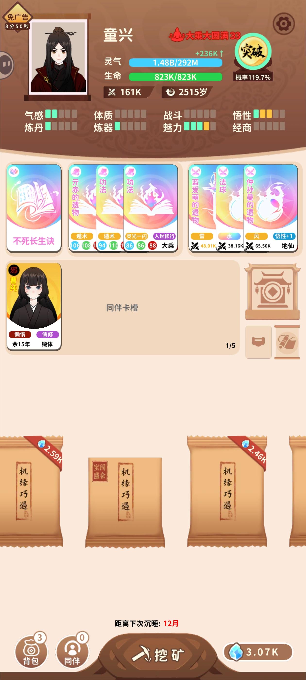前期肯定要看广告把不死长生诀弄出来,弄出来了过后就需要刷轮回点了,怎么刷呢?开局前期先把宝阁调成10年内碰两次,前期有钱的情况下每个宝阁必须开找枯木逢春和恢复术或大恢复术,其他卡包一个也别点,只点宝阁,找到这两个后,后面宝阁只需要砍价拿突破丹就行几率80%再去突破(有更好的功法可以换,两个词条最顶搭配:恶魔书印+大恢复术或枯木逢春),武器词条要体质,武器会坏可要可不要,然后就是无限挖矿-宝阁-突破