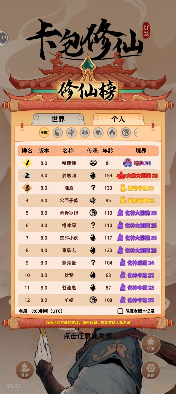 全成就拿下,最麻烦的就是登天路了,纯磨时间🥲其次是那个狐狸宠物,毕竟目前版本宠物用处非常小,单独去刷就是浪费时间,平时点又污染卡池,最后是搞了个长生,刷了快一千岁。简单说一下游戏,其实重要的就两条,灵气和突破概率,每种传承就是一个职业,能解决突破概率就想办法凑灵气(气感,实际上灵气根本不是问题,不考虑上榜的话),能有大量灵气供应的就凑突破概率(炼丹,药王谷,雨润万物,入土为安),套路都大同小异