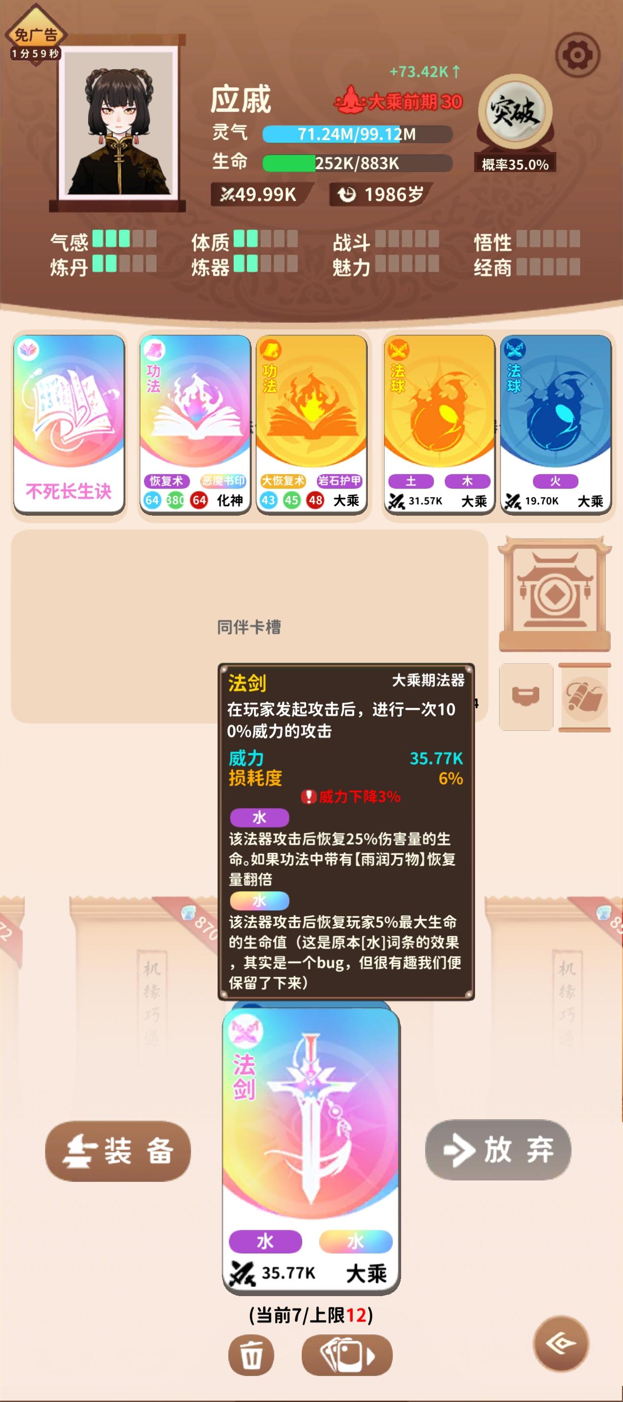 一路屠屠直到成仙,而且七情全都是恶(wù)万魂幡难度还是比人皇旗高多了,打得太久居然能凑到四个金色汇聚比较好用的几个功法有:入土为安(必备,哪怕是紫的都很有用)大恢复术(打不死=满血复活,回血还有灵气,爽)岩石护甲(恢复术下位替代,多虐菜基本能回到快满血)恶魔书印(打不死我,嘿嘿)浴血术(毕竟恶行值太高了每张牌都要打架)炼魂咒、遮天咒都比较一般,高品质