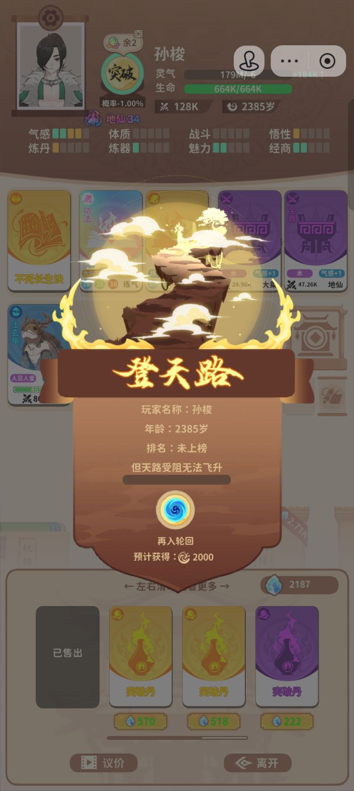 玩了大概五六天,看了23个广告,终于地仙了。