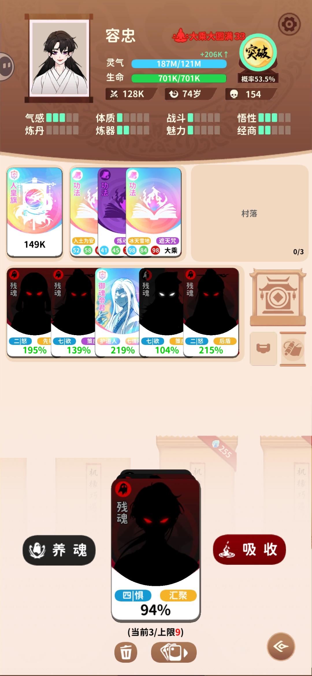 看广告后返回, 游戏在后台意外终止,重新进入后变成了图一,点击突破后变成了图二,最后查看修仙榜记录,竟然飞升三次。图四是飞升前截图。