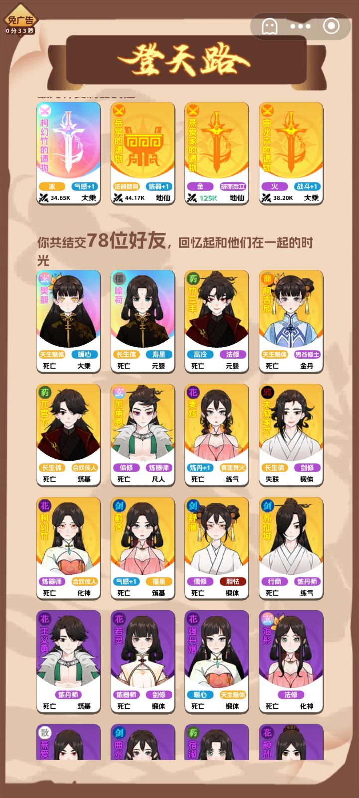 作为一名四转修士,决定随手写一篇新手玩这个游戏的大致方向。1开局:先用不死长生诀不停的刷轮回点,核心就是锻体诀或锻体神术,进阶一点可以使用枯木逢春加恢复术。2关于人物:第1个人物,遇见她时会要求给她一个东西,反正一直不换,直到她说用一个什么草来换才换,之后当同伴时完成任务,再过几年就能解锁第1个剧情功法。第2个人物,就是遇见他时一直聊天,不救小孩,走了也不就,过几年遇见他时,灾民抢粥时救人就能收为