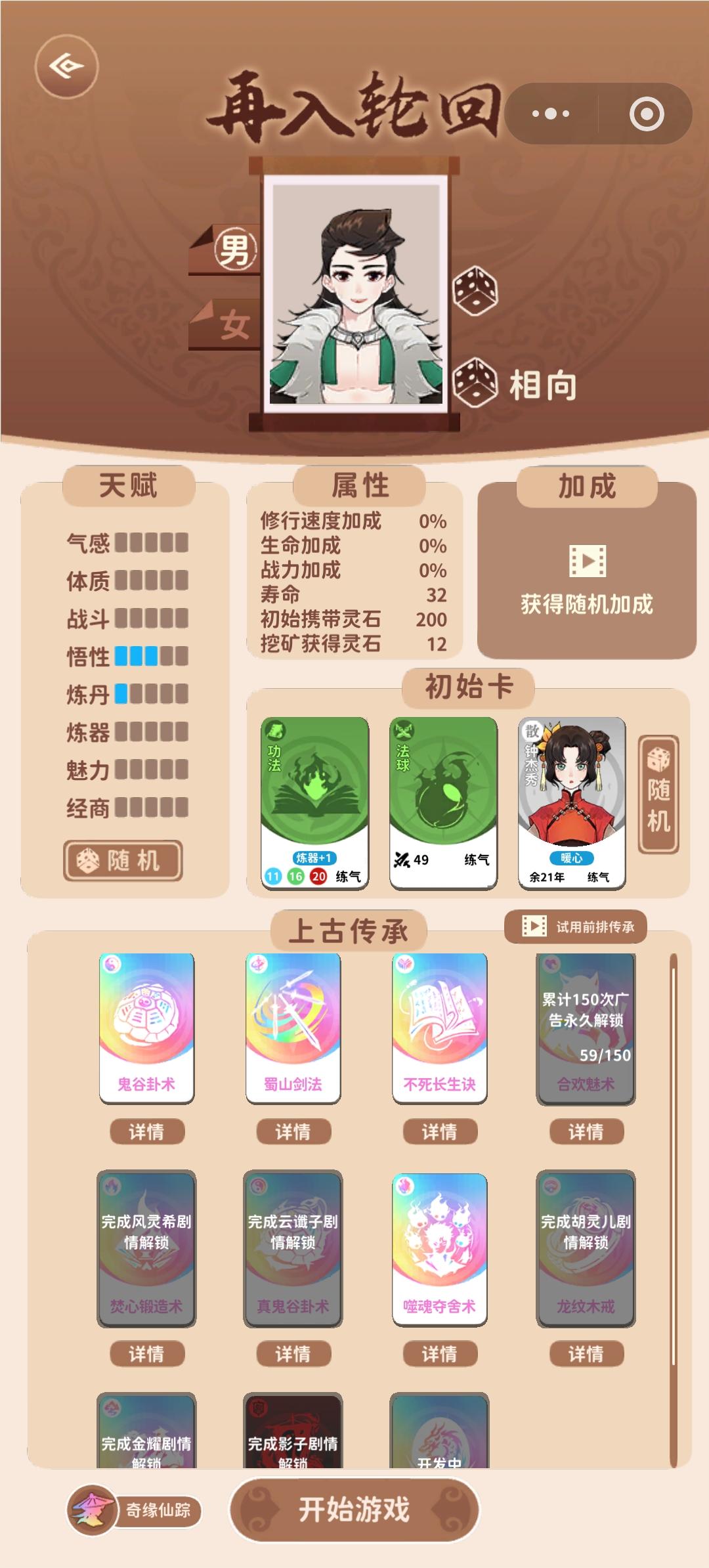 个人DIY,已发送给官方,被采纳几率不高,大家可以先当个乐子看看——新传承:万世轮回功——无法获取灵力,每次死亡后会重新复苏并提升境界——轮回: 因灾厄/敌人 死亡时会重新复苏并提升3/1个小境界—通幽: (获得 替死咒 cd:6个月) 同伴下一个运势为死劫时,可以使用替死咒替死,复苏后自身随机天赋+1,寿命+5年—阴气缭绕: 敌人战斗力下降20%,结交同伴概率降低20%—天