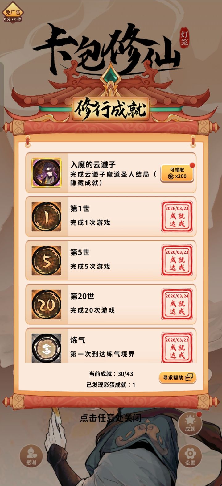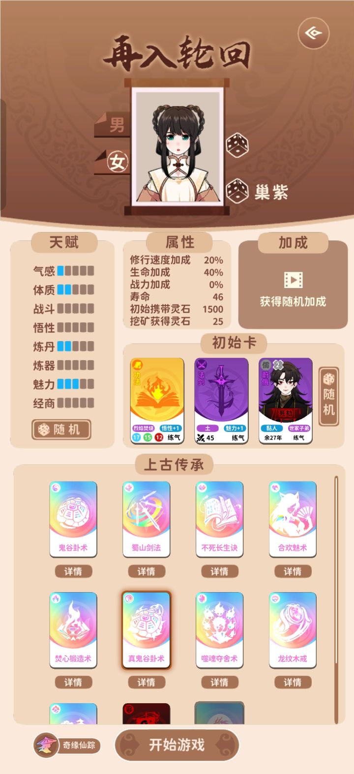 建议先看完真鬼谷卦术攻略。 传承要选真鬼谷卦术,刷魅力3~4点 伙伴刷新推荐如图二死劫(不用看气运)最好 伙伴卡左上角为气运,1点气运恶运次之 其他的运气什么的别要(这成就开局要让3个伙伴死然后就会变成魔道圣人)开局先不要突破等云谶子的第一次来 然后来到实力练气选择加一个伙伴(不喜欢看广告的可以不要)然后你的一点运气伙伴卡先不要丢 等他死加灵气(你有更好的伙伴品质,词条可丢,(粘人的