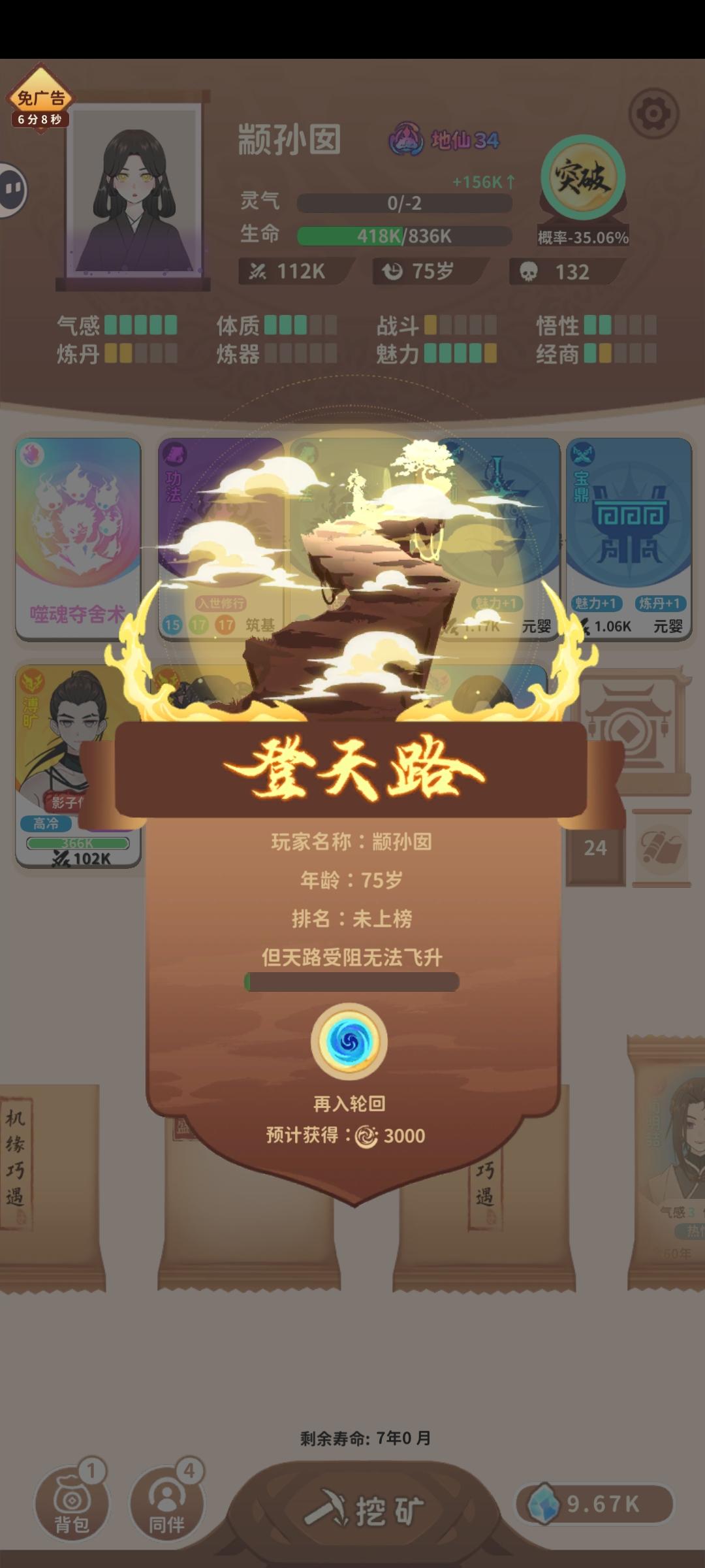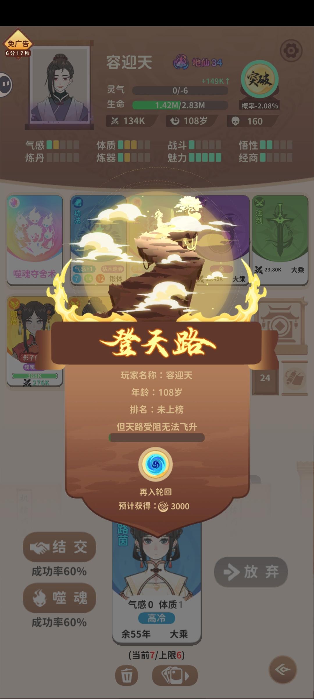 今天花了好几个小时,终于让我给挤上去了当然了,在这里也提一下冲榜心得。首先噬魂夺魄只需要两个属性,一是魅力,用于提高结交概率,二是悟性,用于刷到合适的功法,其中魅力>悟性。在本局开始之前,这两个属性至少要三以上。其次,开局最好刷一个遁术/御风而行+冰天雪地。遁术/御风而行很好理解,用于逃跑,噬魂夺魄等于自带-50%血上限,跟怪打很吃亏,所以为了速刷,一般选择拔腿就跑。至于