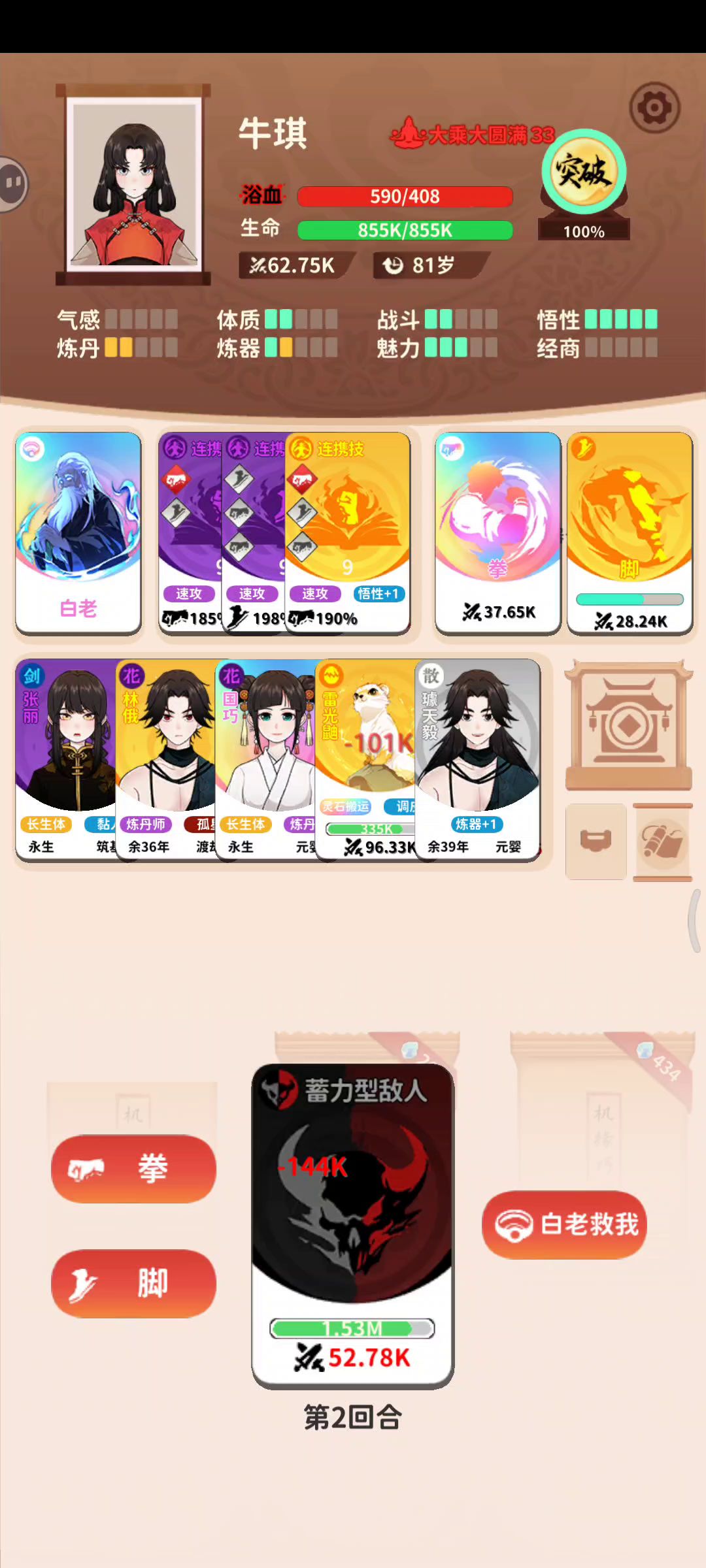 不对家人们天塌了,后面那段视频,每次点击攻击,他都判定加了一个回合,也就是说打完加的血气更少了那这个无影拳脚攻只能拿来打白老的时候用了,因为那个时候不需要血气,只需要赢