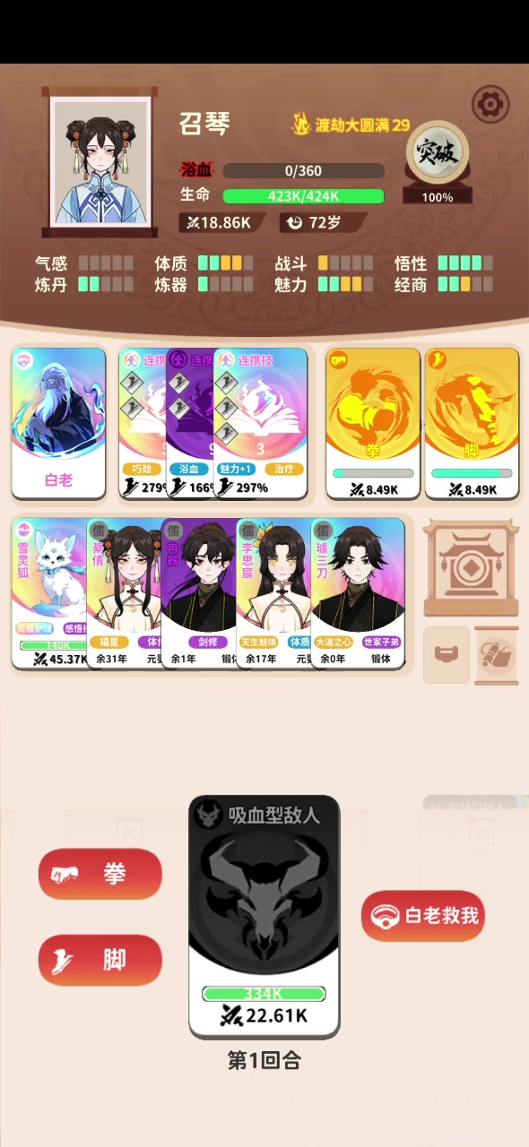 核心是速攻,傻瓜式玩法就是全选拳/脚,额外也只选一个就不会中断输出,招数越少越好,不必太看重词条,遇怪基本两波拿下,必要时可以sl感悟功法。#卡包修仙TapTap测试版