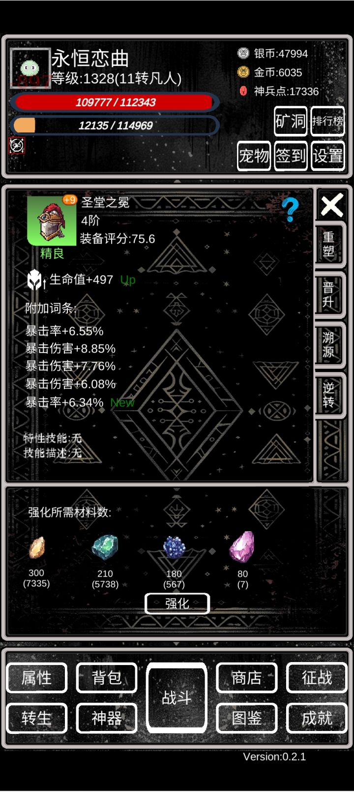 ③装备强化,每强化三次装备就会获取一个词条,词条满了就会随机提升一个词条