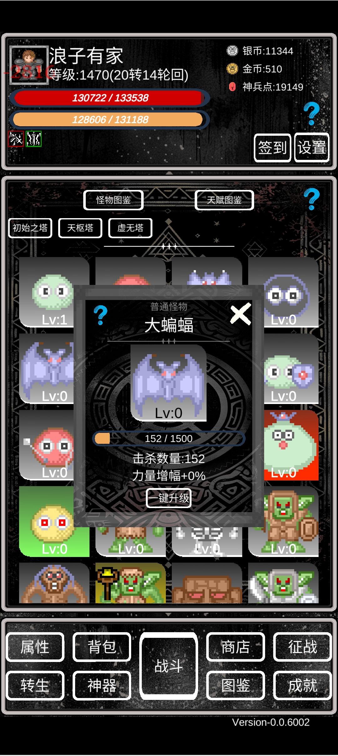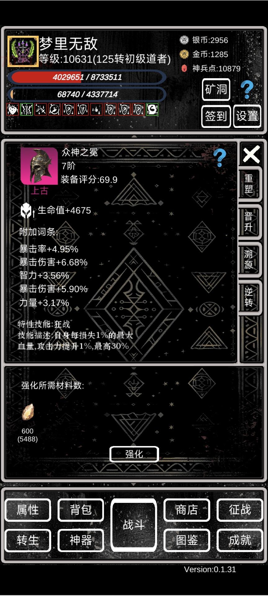 萌新攻略 ①开局依靠转生拉属性,等级够了就转,轮回先不急。 小细节: a、转生给的天赋点优先点满上面的,加攻击暴击那些,然后再往左点出命中率。 b、转生的时候四维可以roll,尽量加到体质和力量上。 c、转生的时候一定要穿最好的装备,并且强化拉满,能赚神兵点(非常关键!!!) d、离线挂机的时候尽量找BOSS挂机(BOSS看图鉴),掉的5阶装备分解能拿神兵点。具体操作是:不要勾选使用离线战斗次数,