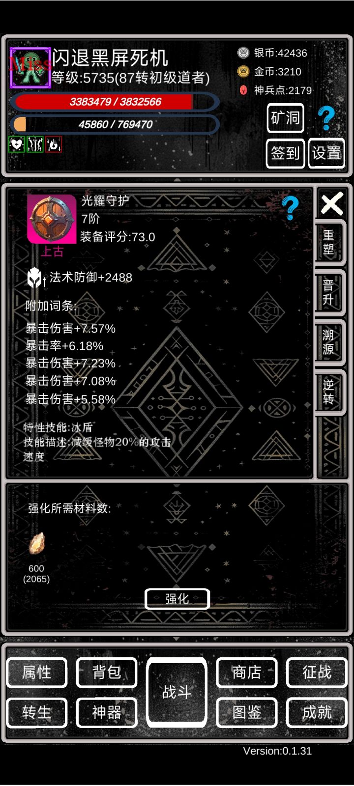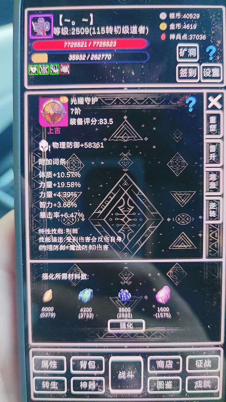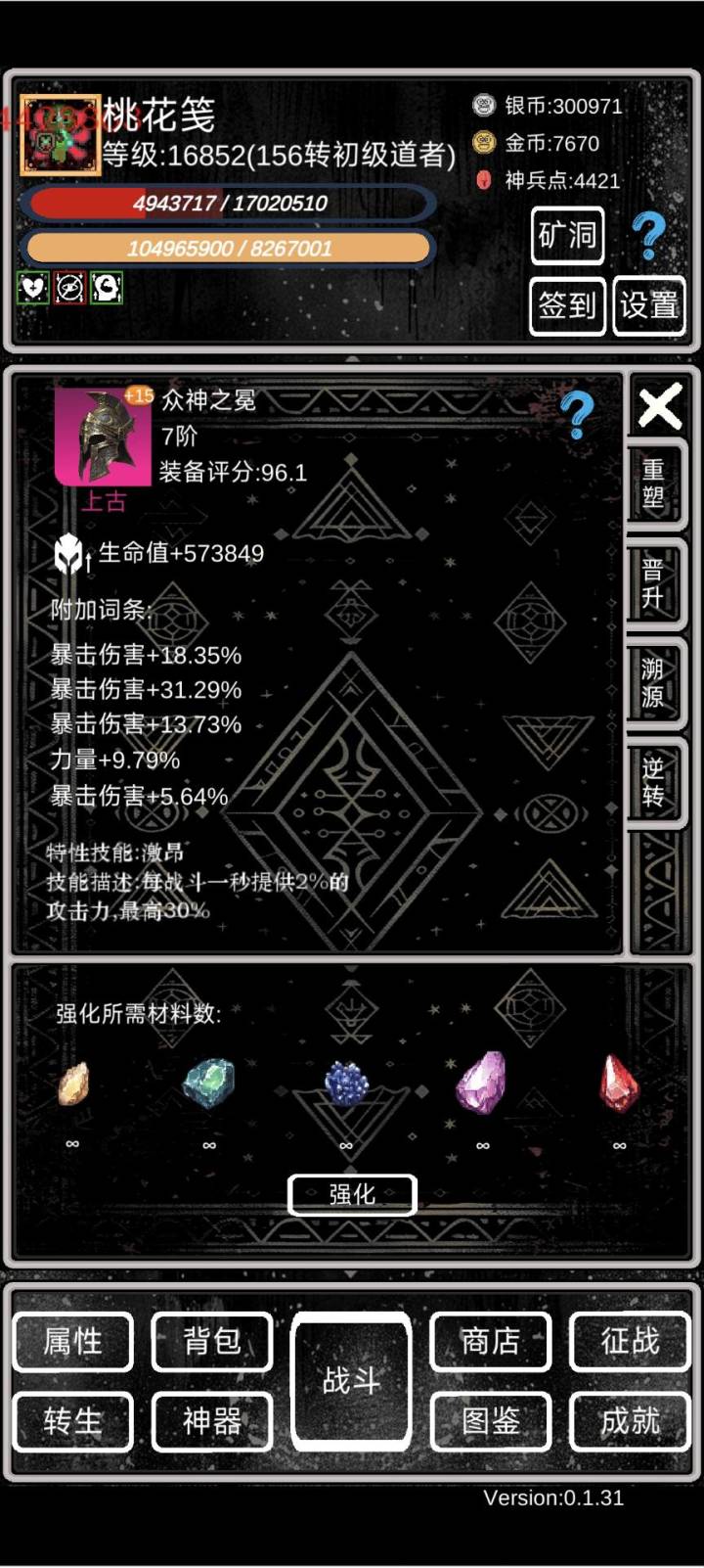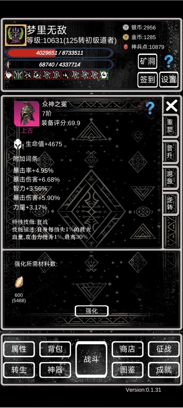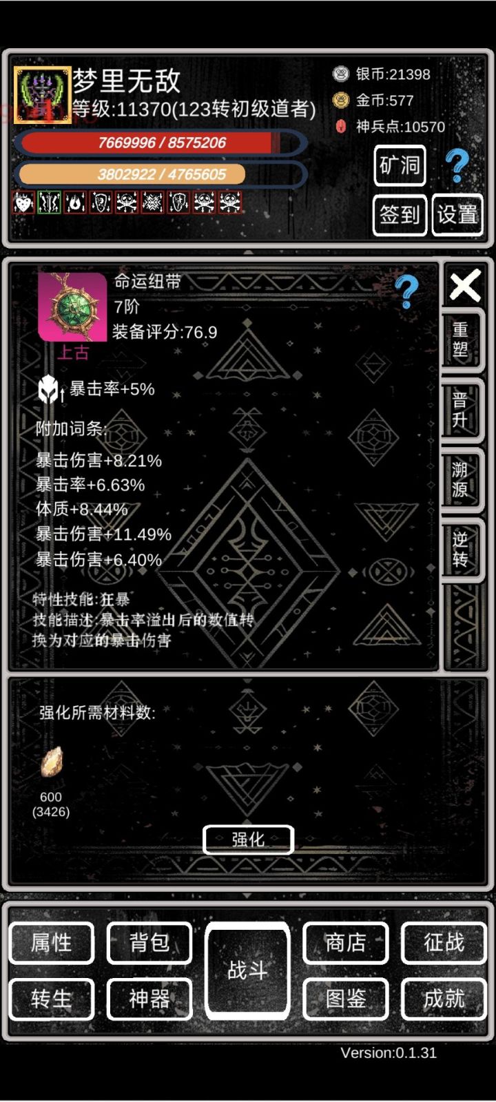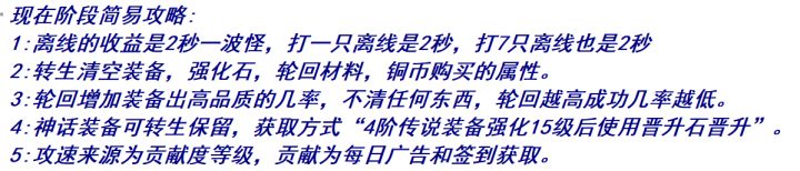 萌新攻略①开局依靠转生拉属性,等级够了就转,轮回先不急。小细节:a、转生给的天赋点优先点满上面的,加攻击暴击那些,然后再往左点出命中率。b、转生的时候四维可以roll,尽量加到体质和力量上。c、转生的时候一定要穿最好的装备,并且强化拉满,能赚神兵点(非常关键!!!)d、离线挂机的时候尽量找BOSS挂机(BOSS看图鉴),掉的5阶装备分解能拿神兵点。具体操作是:不要勾选使用离线战斗次数,