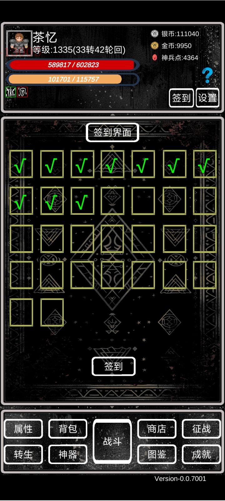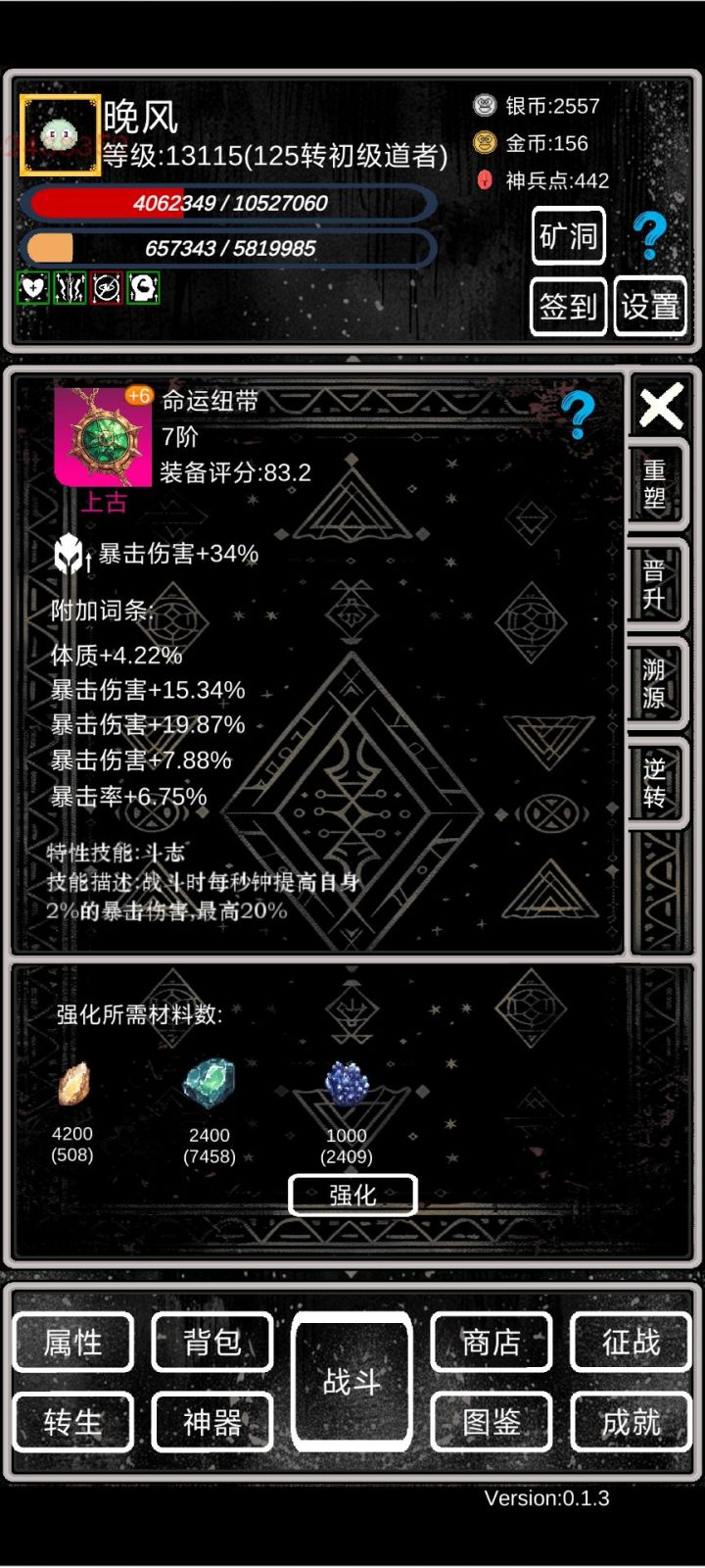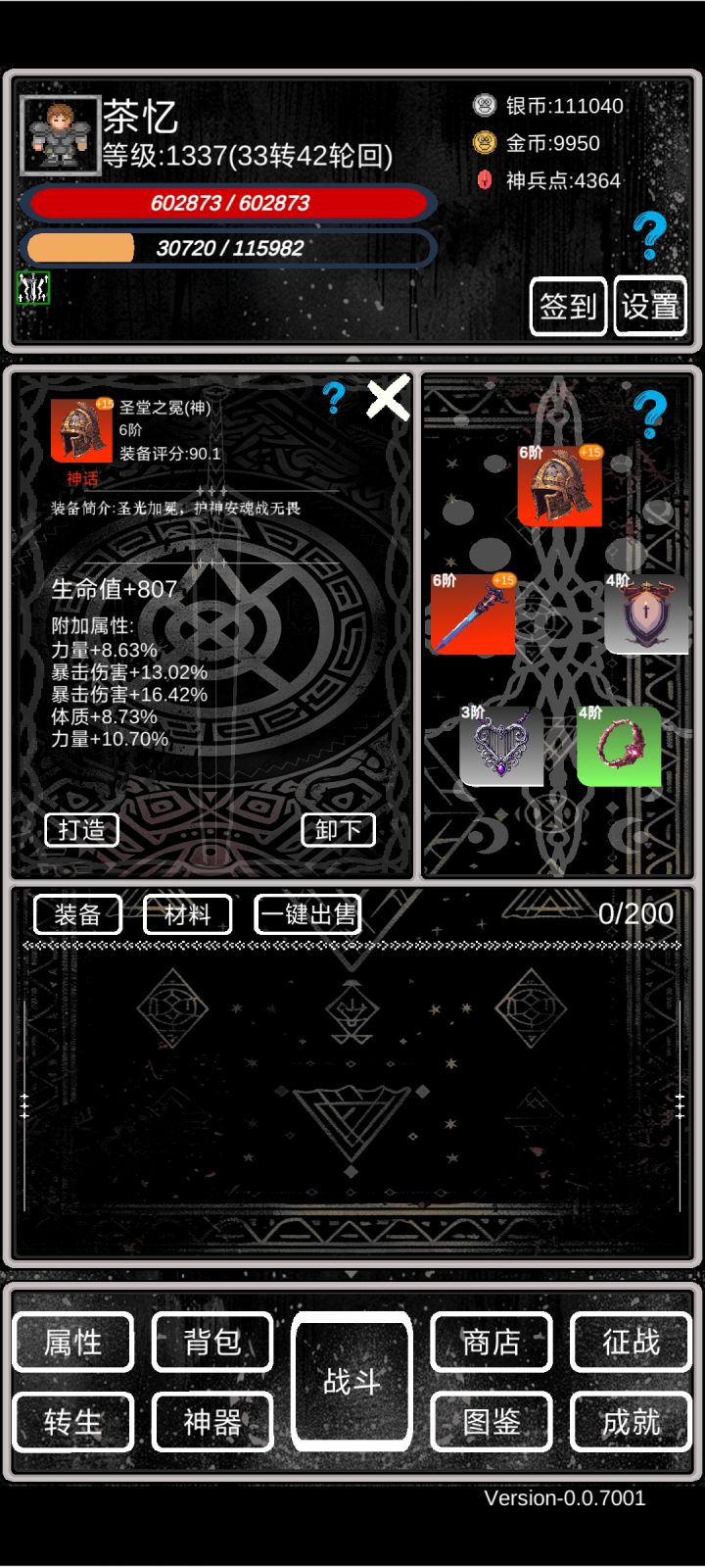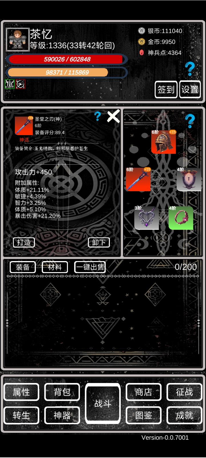 萌新攻略①开局依靠转生拉属性,等级够了就转,轮回先不急。小细节:a、转生给的天赋点优先点满上面的,加攻击暴击那些,然后再往左点出命中率。b、转生的时候四维可以roll,尽量加到体质和力量上。c、转生的时候一定要穿最好的装备,并且强化拉满,能赚神兵点(非常关键!!!)d、离线挂机的时候尽量找BOSS挂机(BOSS看图鉴),掉的5阶装备分解能拿神兵点。具体操作是:不要勾选使用离线战斗次数,
