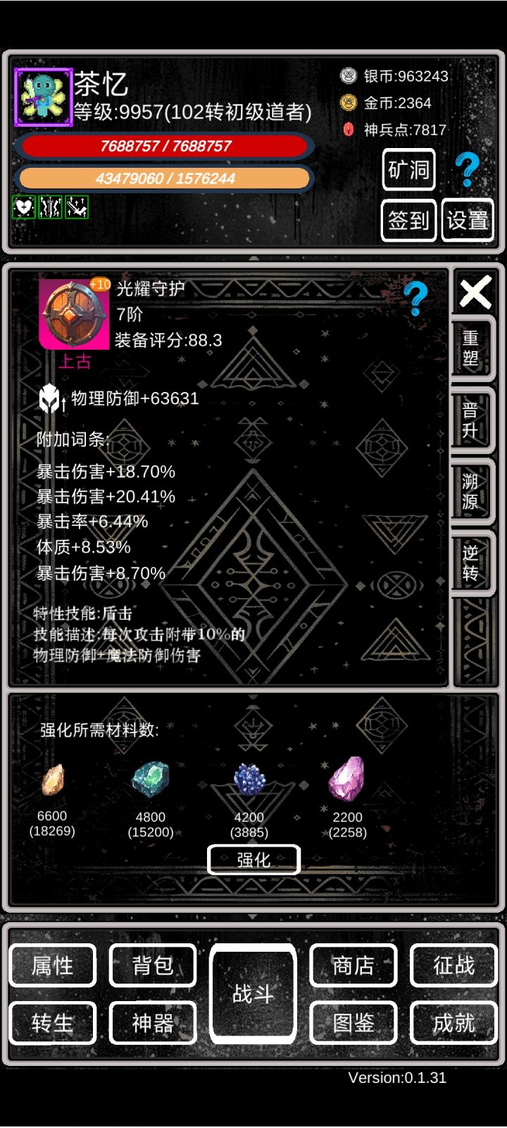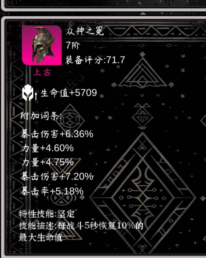 如果还有新的特性,看到的人帮忙截图发在下面做装备优先级顺序: 盾牌>武器>头盔 爬塔副本套:冰盾+倒刺刀+狂战头 经验材料套:荆棘盾+剔骨刀 (这个版本饰品和戒指优先级最低最后制作)经验天穹天赋选择:征服者>猝火>穿孔>猝毒 但点了这些天赋爬塔副本会慢一点,但转生可以更快,长远来看也许是更优选择,已经爬到60层塔的玩家可以稳定拿到晋升石这个时候可以尝试选择这套天赋。盾牌特性:1