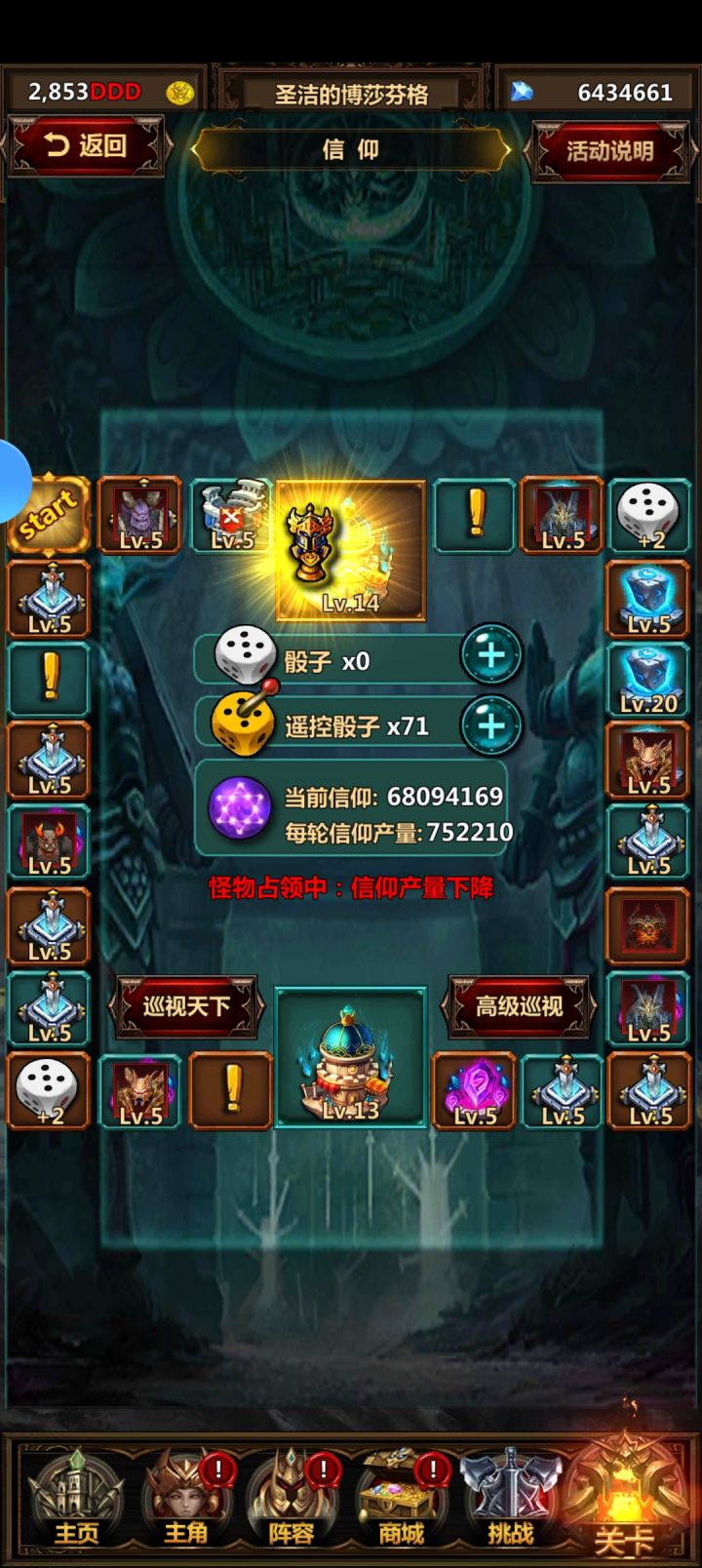 #暗黑主宰 信仰是刷神格必备资源,从收益上来看,每次可以主升一个小建筑到神圣天堂5,加2万每圈,消耗45个小建筑劵。大建筑从收益上来看选择大教堂,每级提升10%圈信仰收益。