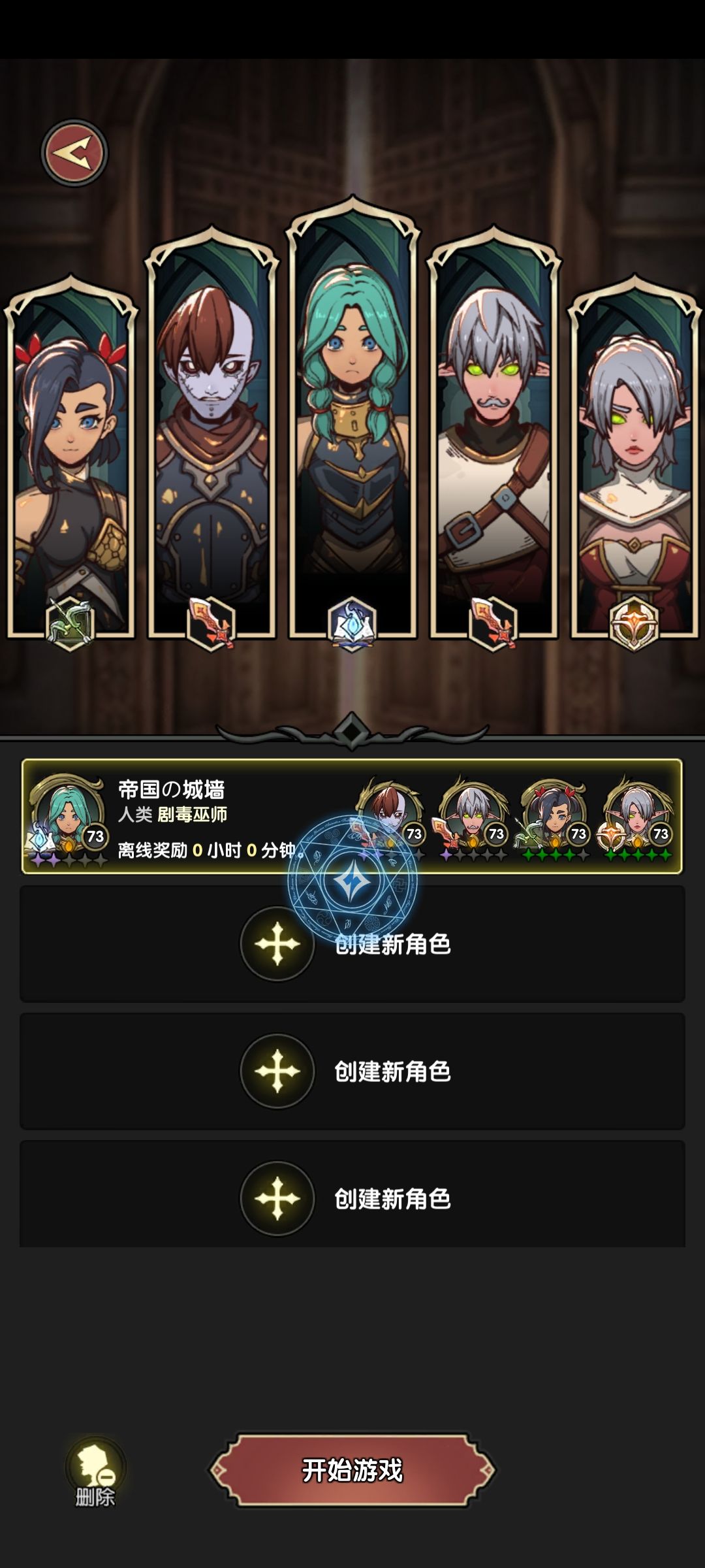 作为一个第一次接触这款游戏的新手的玩家写一点自己的心得仅供参考不喜勿喷。 开局建议选择游戏比较强势的职业比如法师战士都可不建议弓箭后期发力的职业前期不好平滑过渡。 种族选择建议精灵法或者人族战,精灵有极速天赋法师职业比较友好。 阵容方面建议二个精灵法师一个人狂战士一个人牧师一个亡灵弓箭。最好也留一个牧师遇到特别难过的本可以上双牧师。 进游戏后首充是送的,想长期玩的玩家可以氪金一个30的粉钻永久免广