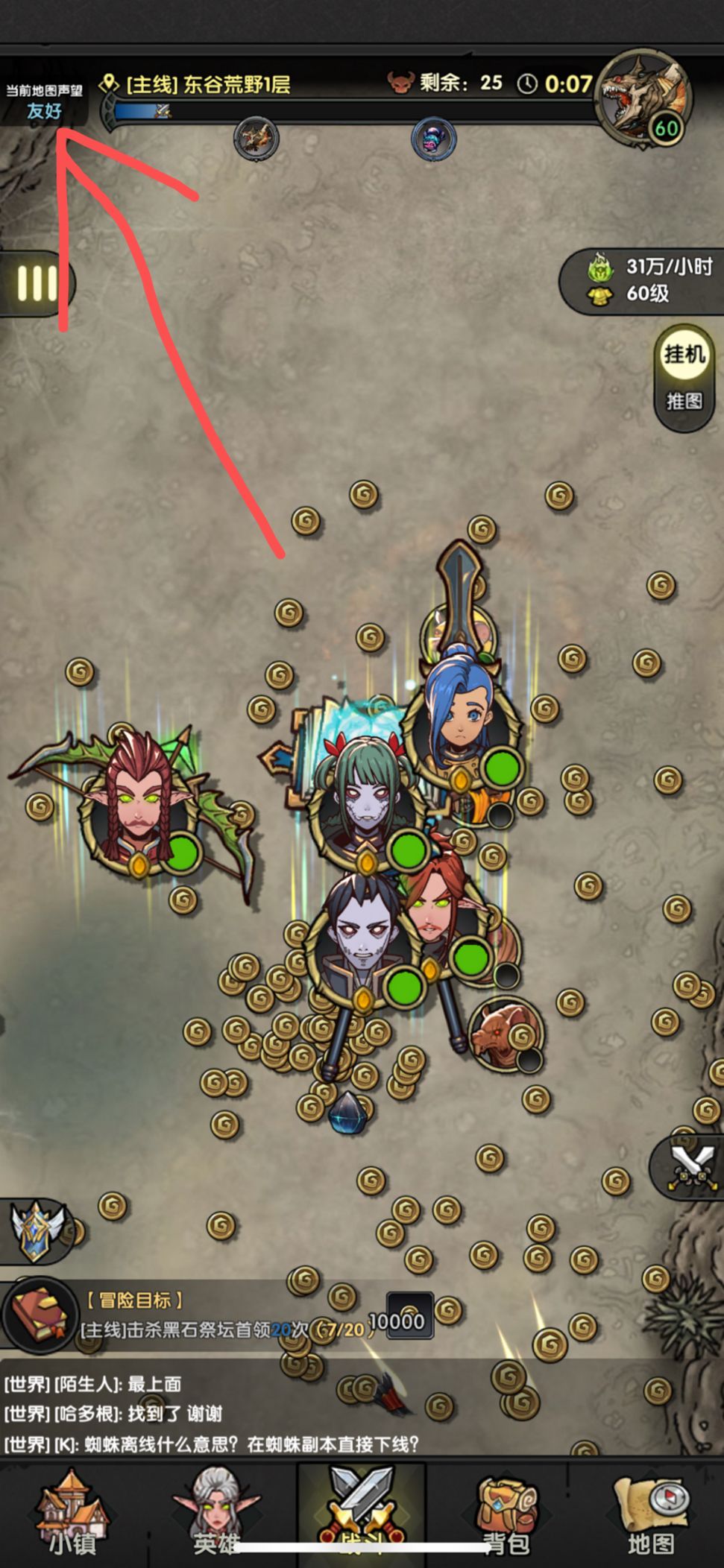 先上图表成果,还有一些细则需要测试,待准备好了再改进效率篇。 当然我不敢说我是国王里效率最高的, 只不过分享一些思路给大家。 地图选择: 东谷荒野(进阶) 进阶地图会在通关后开放, 可能存在开放的等级限制。 在左上角,声望的左侧切换。 没有进阶地图的情况下, 刷无经验衰减的最低级地图即可。 阵容: 1狂战+3毒+1元素 狂战的作用是抗伤+冲锋开怪+大风车清怪, 毒法纯刷子,元素是替代弓的buff工