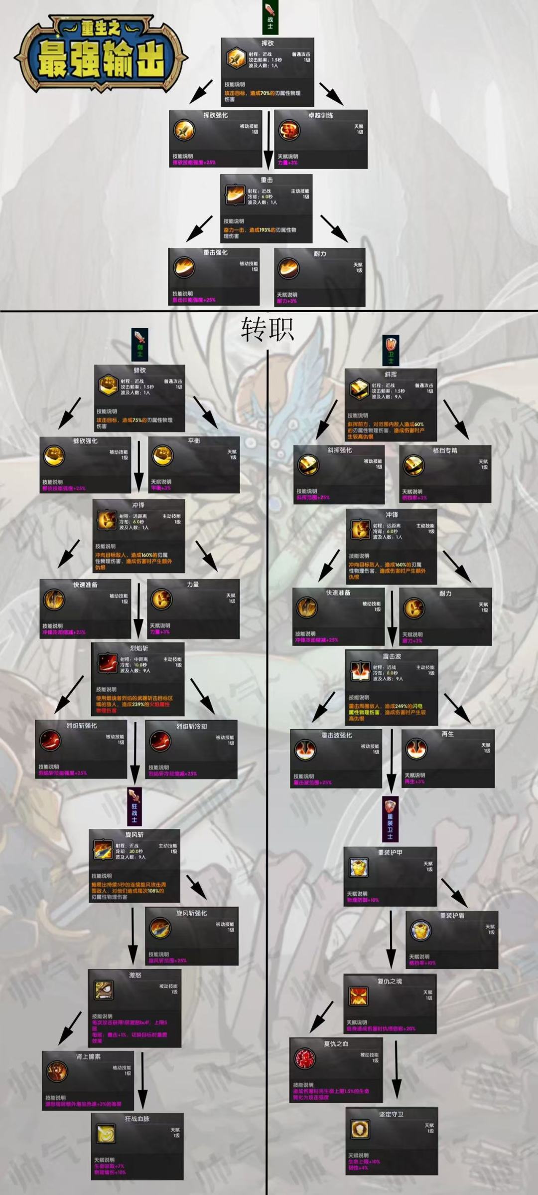 #游戏推荐#重生之最强输出 #游戏攻略 一、角色创建: 种族:人类是主属性加攻击。精灵加攻击速度。亡灵加暴击率。3大职业,输出最高的是法师,单体输出最高。战士近战攻击,每次冲在最前面,拉仇恨,有吸血。弓箭手,可以同时射出多支箭,穿透怪物,攻击速度快。下面的转职预览,随便选,50级前可以免费重置。 二、进入游戏: 建议前期买个(进阶卡)和(典藏卡)收益丰厚。5级后酒馆抽卡,人物点技能,有钻石的去军械