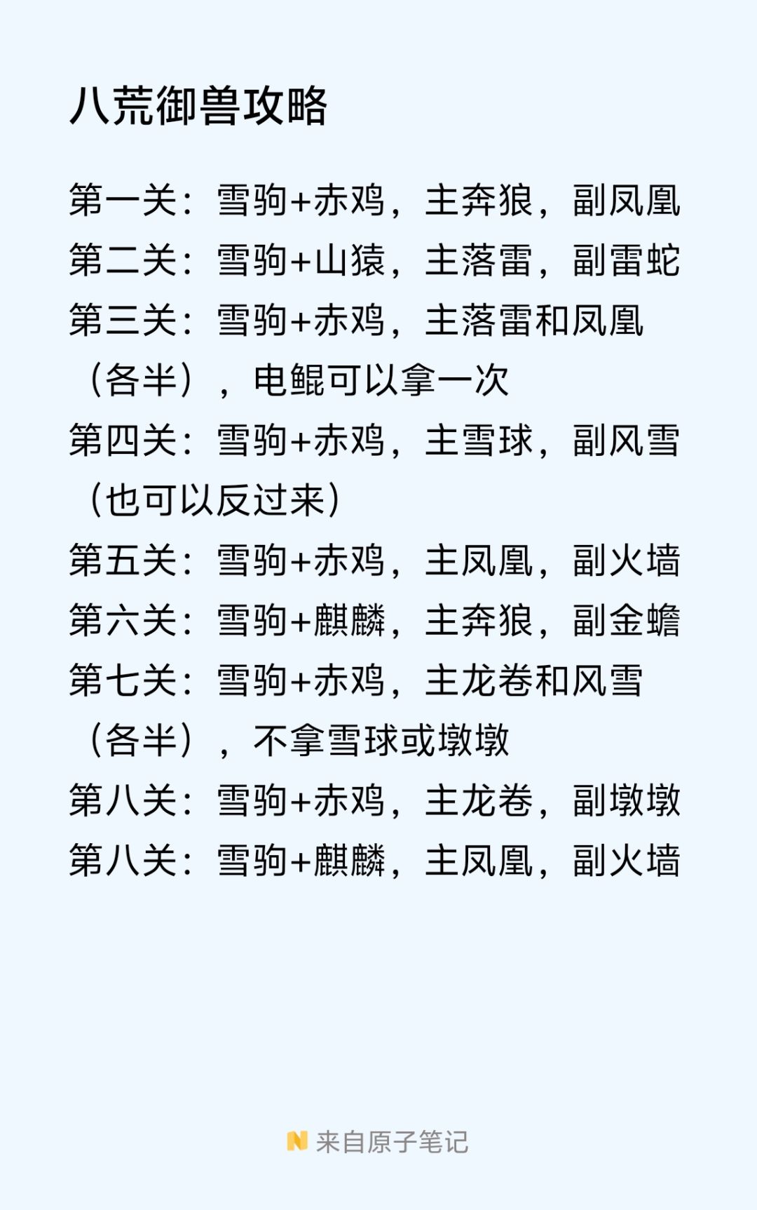 山海记八荒御兽攻略 八荒御兽攻略: 第一关:马+火鸡,拉满凤凰,副狼,2趟技能秒杀boss 第二关:马+猴,主落雷副闪电吊打 第三关:马+麒,拉满凤凰,副树形闪电雷蛇 第四关:马+鸡,主小风 第五关:马+鸡,主凤凰3连火墙 第六关:马+麒,主蛤蟆副狼 第七关:马+鸡,主双风,不学雪球雪人 第八关:马+鸡,主龙卷,别学极速龙卷,副小风雪人 第九关:马+麒,2连火墙,主凤凰副火墙 Boss针对攻略: