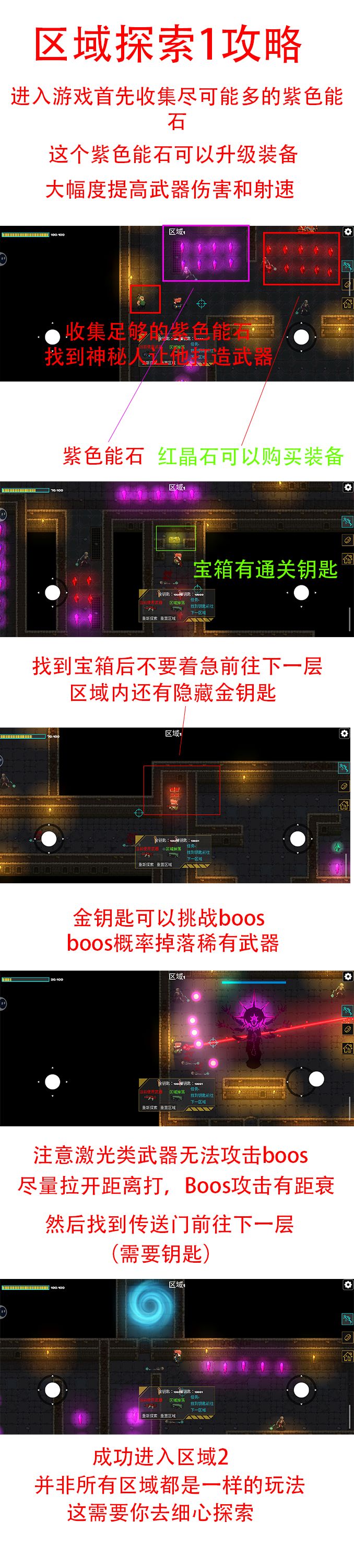 这游戏挺好上手的,说白了就是刷资源,资源主要集中在第一关,也就是红宝石紫宝石都在第一关刷,嘎嘎快,红宝石的作用不大,买把星穹就用不上了,星穹就是那把三发散弹【其他枪好像有攻击力上限,但是星穹我目前是没发现有上限的】,避雷那把23w的速射枪,感觉和初始枪一点区别没有,攻击力上限50,还没额外增伤刷宝石路线也很简单,不需要跑全图,主要是刷紫宝石,紫宝石刷够了红宝石也差不多够一把星穹了区域一的按我发