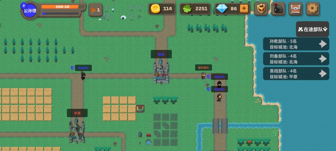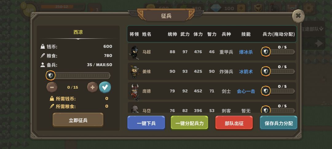 自从发现打掉敌人的部队选择放了可以反复打之后…… 开局狂点广告神将不点好的,卡出来两个神将凑一个七人队守一个城,前期只要发育不太慢有两个技能基本都能守住,看那边来敌人部队就放两个满兵将领过去堵路(8将城就放一个)路上遇到直接点撤退,在隐身期过去之前改变目标然后原地驻守,这样守住进攻之后放一个敌方将领撤退就会让他陷入攻城→撤退→遇敌→失败撤退的循环,因为没兵所以不管放几个将领你出战的将领都只能获得十