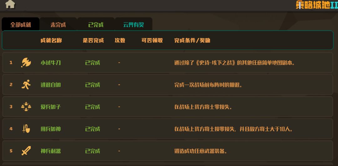 基础成就 小试牛刀:通过除了《史诗-垓下之战》的其他任意简单地图剧本。 进退自如:完成一次战场前布阵时的撤退。 爱兵如子:在战场上我方将士零损失。 用兵如神:在战场上我方将士零损失,并且敌方将士大于10人。 神兵利器:锻造成功任意武器装备。 广告神将:获得一次广告神将。 霸业可成:通关任意中等难度的地图剧本。 问鼎天下:通关任意困难难度的地图剧本。 神将封顶:任意一名将领等级达到10级。 科技文明