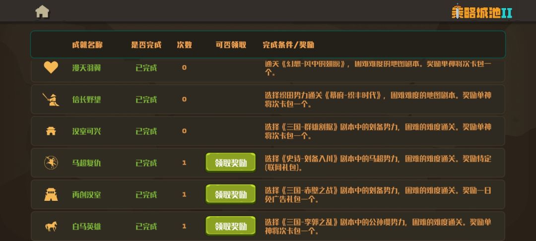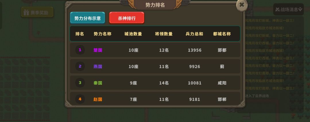 地图史诗【李郭之乱】模式困难。 开局只有【蓟】【北平】两个城池,都城【北平】。 游戏开始的时候看个神将广告,刷个4神技的群攻神将就行。 进入正题,游戏第一阶段,刷到群攻神将之后立马北平集体出兵南皮,90%几率能打过,还会给你剩下一部分兵力。。这个时候80%几率邺城会派兵来打你,其中田丰有群体治疗,有点难度,多打两次能赢,,不赢没事,不赢就秘籍不早点结束,直接退出游戏,重新登录又可以重新打一次。运气