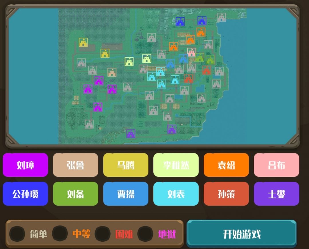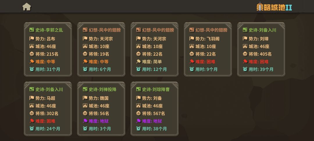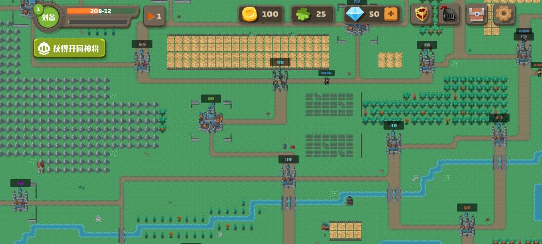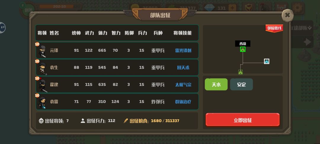把1城兵下了(分配0兵力),敌4就会来打, 然后再把兵带上,开打直接撤退,停在2门口 同步进行: 3城留一个将,其他到2城, 到了后,留两个将,其他派到1和3的路上。 这样敌1就会派1到2个将来打你的3(等待2次),打赢它,招降到1-2个带技能的好将,全部回2出兵把1打下来,这样就有5-6个好将,看情况打紫色(黄色打蓝色了,直接打),这样基本无敌。 推荐阵容:前排-3统法重甲兵(法师有技能优先)