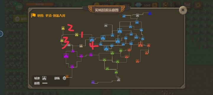 把1城兵下了(分配0兵力),敌4就会来打,然后再把兵带上,开打直接撤退,停在2门口同步进行:3城留一个将,其他到2城,到了后,留两个将,其他派到1和3的路上。这样敌1就会派1到2个将来打你的3(等待2次),打赢它,招降到1-2个带技能的好将,全部回2出兵把1打下来,这样就有5-6个好将,看情况打紫色(黄色打蓝色了,直接打),这样基本无敌。推荐阵容:前排-3统法重甲兵(法师有技能优先)