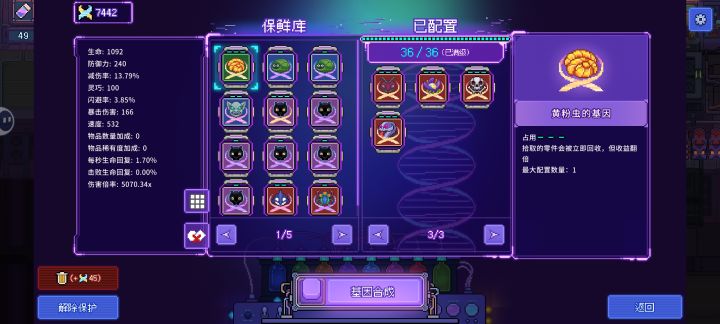 器官不是重点,重点是基因搭配。器官的搭配保证生存性为前提就可以,因为伤害已经很充足了。生存性提升是搭配电鼠丘的腹(承受额外伤害)+幽灵的腹(命中降低)+石像鬼的翅(格挡伤害)+飞影龙的翅(额外闪避),基本无敌了,除了陷阱掉几滴血。伤害我用窝窝头的触角触发魂蛆的腹+薛定谔的腹。用魂蛆输出,可以降低坏50%血量无敌的触发几率。主要堆伤害是用凋螂的基因把超过150暴击伤害转化为持续伤害加成,又安