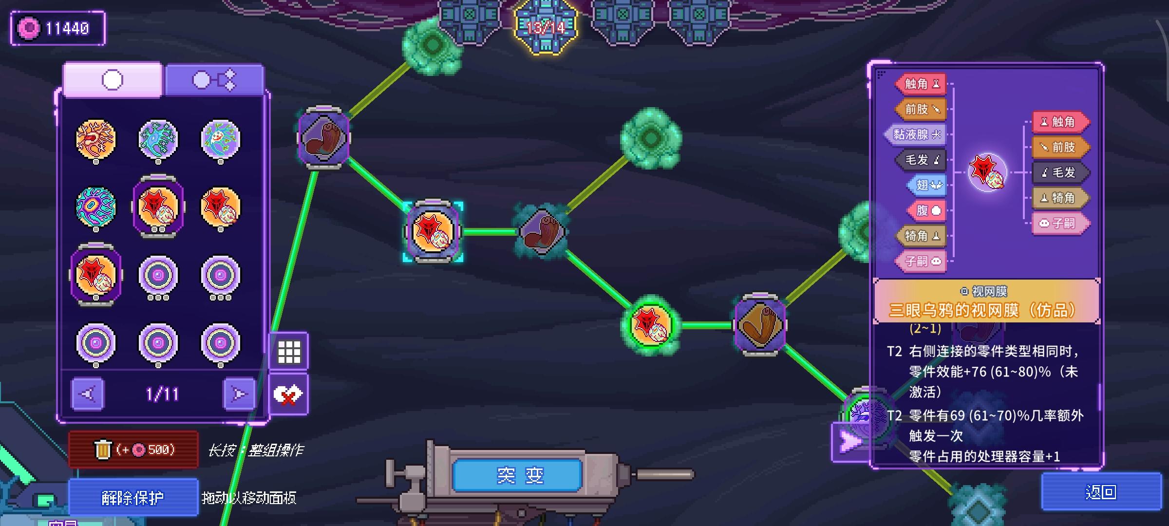 核心思路:基于第一代的几个优化方案,重新搭建的双处理器玩法:第一个处理器:石像鬼的翅+电鼠丘的腹+黄金使徒的翅,这个配置是绑定的:石像鬼的翅由于可以开通5个晶体管,猎犬的视网膜叠加的效能更高,必须留给伤害加成的器官,魂蛆的腹数值再高也只是计算加法,放到第二个处理器更合适,不过因为脑容量的问题,只能配置3个视网膜第二个处理器:花仙子的翅+魂蛆的腹+薛定谔的腹,两个腹放一个处理器,同时触发更保险