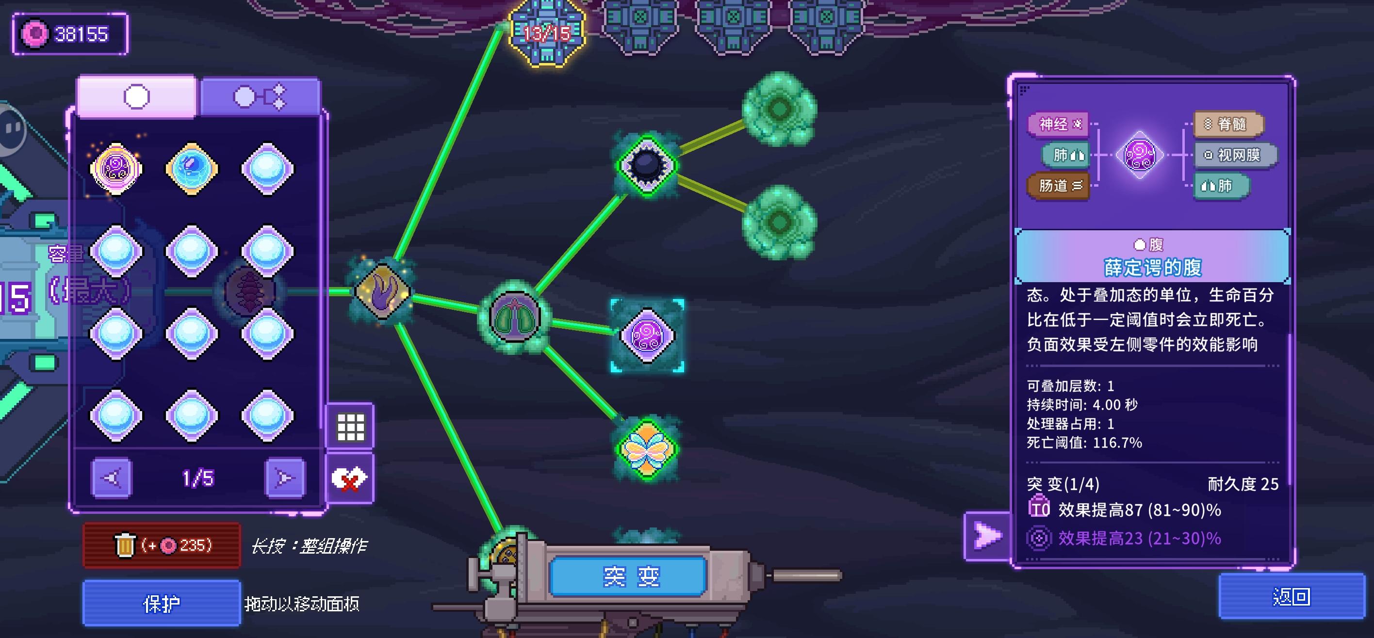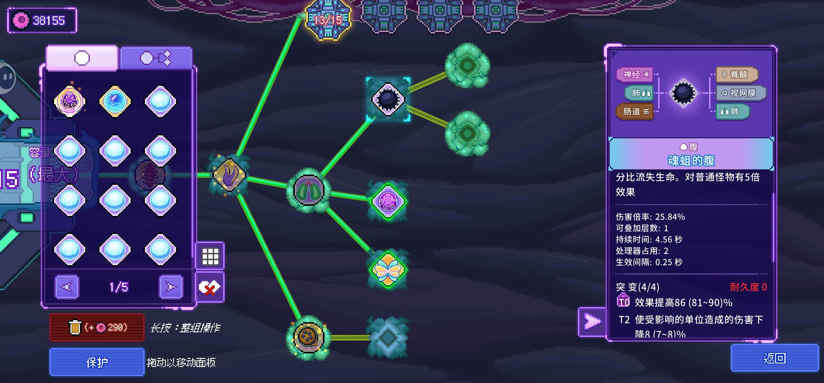 核心思路:基于第一代的几个优化方案,重新搭建的双处理器玩法:第一个处理器:石像鬼的翅+电鼠丘的腹+黄金使徒的翅,这个配置是绑定的:石像鬼的翅由于可以开通5个晶体管,猎犬的视网膜叠加的效能更高,必须留给伤害加成的器官,魂蛆的腹数值再高也只是计算加法,放到第二个处理器更合适,不过因为脑容量的问题,只能配置3个视网膜第二个处理器:花仙子的翅+魂蛆的腹+薛定谔的腹,两个腹放一个处理器,同时触发更保险