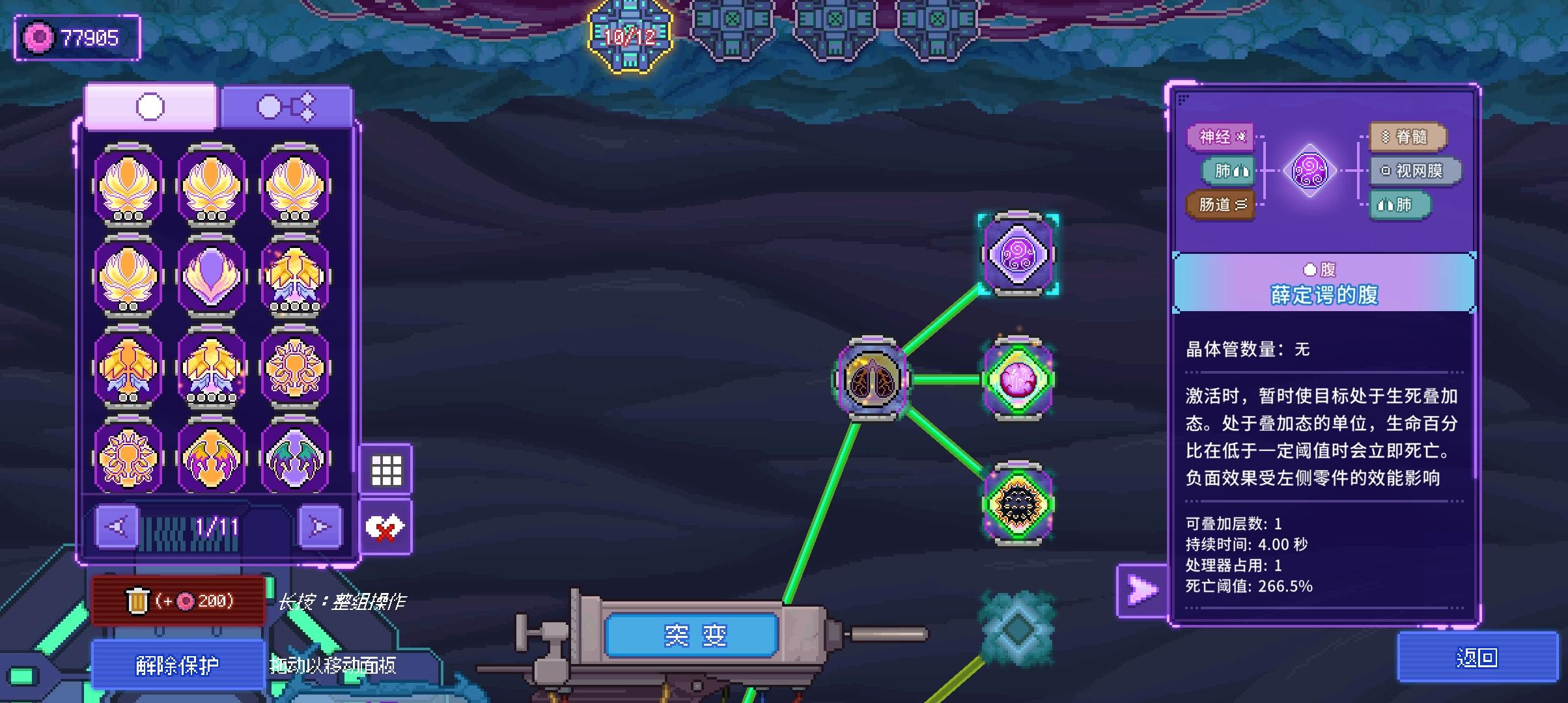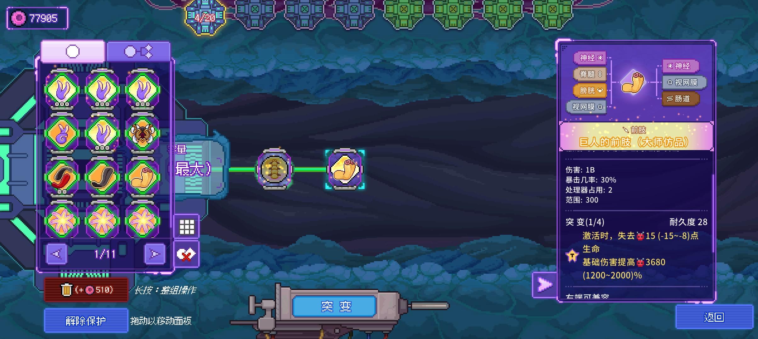 核心思路:基于第一代的几个优化方案,重新搭建的双处理器玩法:第一个处理器:石像鬼的翅+电鼠丘的腹+黄金使徒的翅,这个配置是绑定的:石像鬼的翅由于可以开通5个晶体管,猎犬的视网膜叠加的效能更高,必须留给伤害加成的器官,魂蛆的腹数值再高也只是计算加法,放到第二个处理器更合适,不过因为脑容量的问题,只能配置3个视网膜第二个处理器:花仙子的翅+魂蛆的腹+薛定谔的腹,两个腹放一个处理器,同时触发更保险