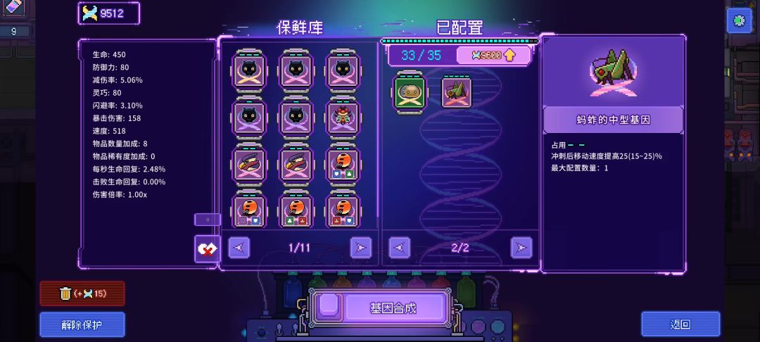 基因编辑界面,已配置的基因栏每次翻页排序都会改变,这不方便编辑。另外可能因为我色弱的问题,防御型和功能型的基因颜色太近很难分辨,建议在右侧大图里标明基因型号
