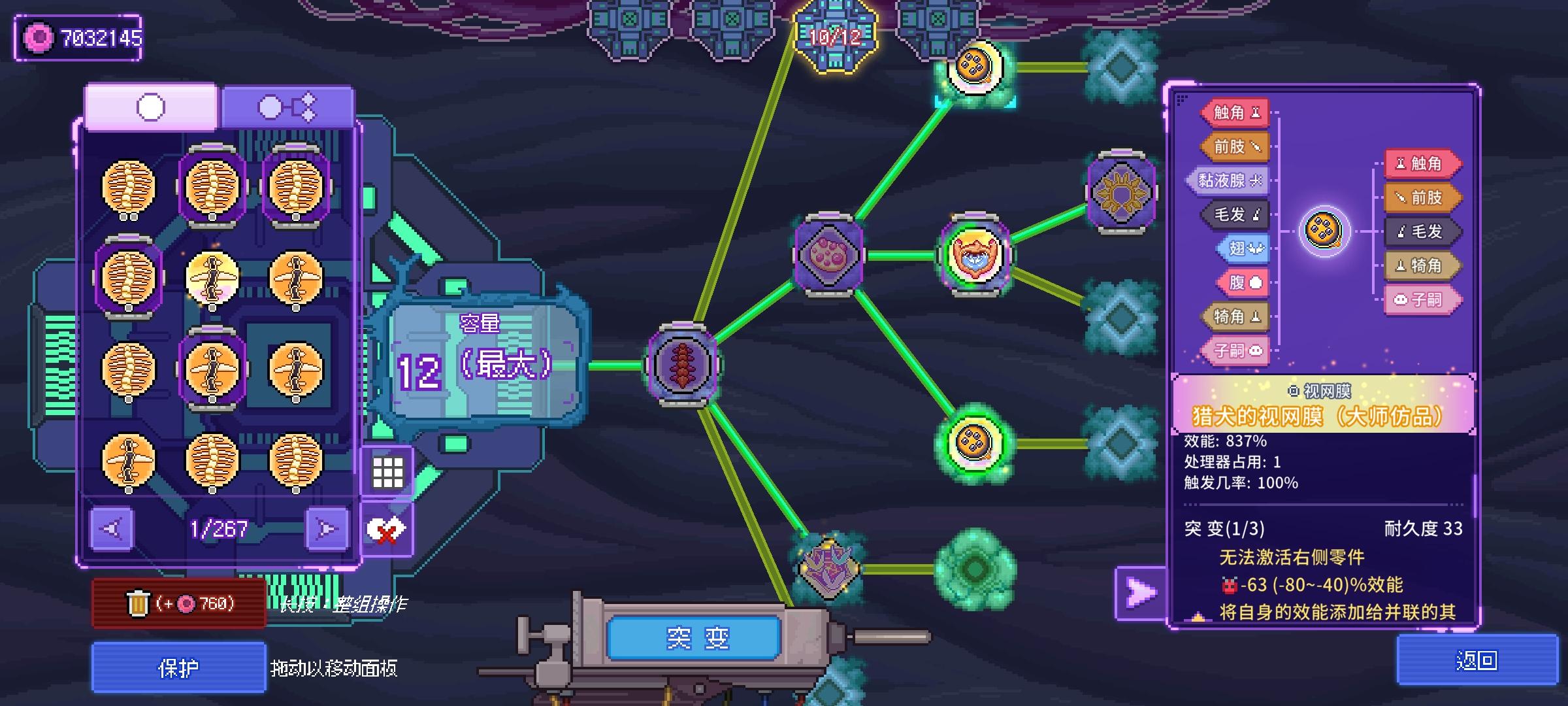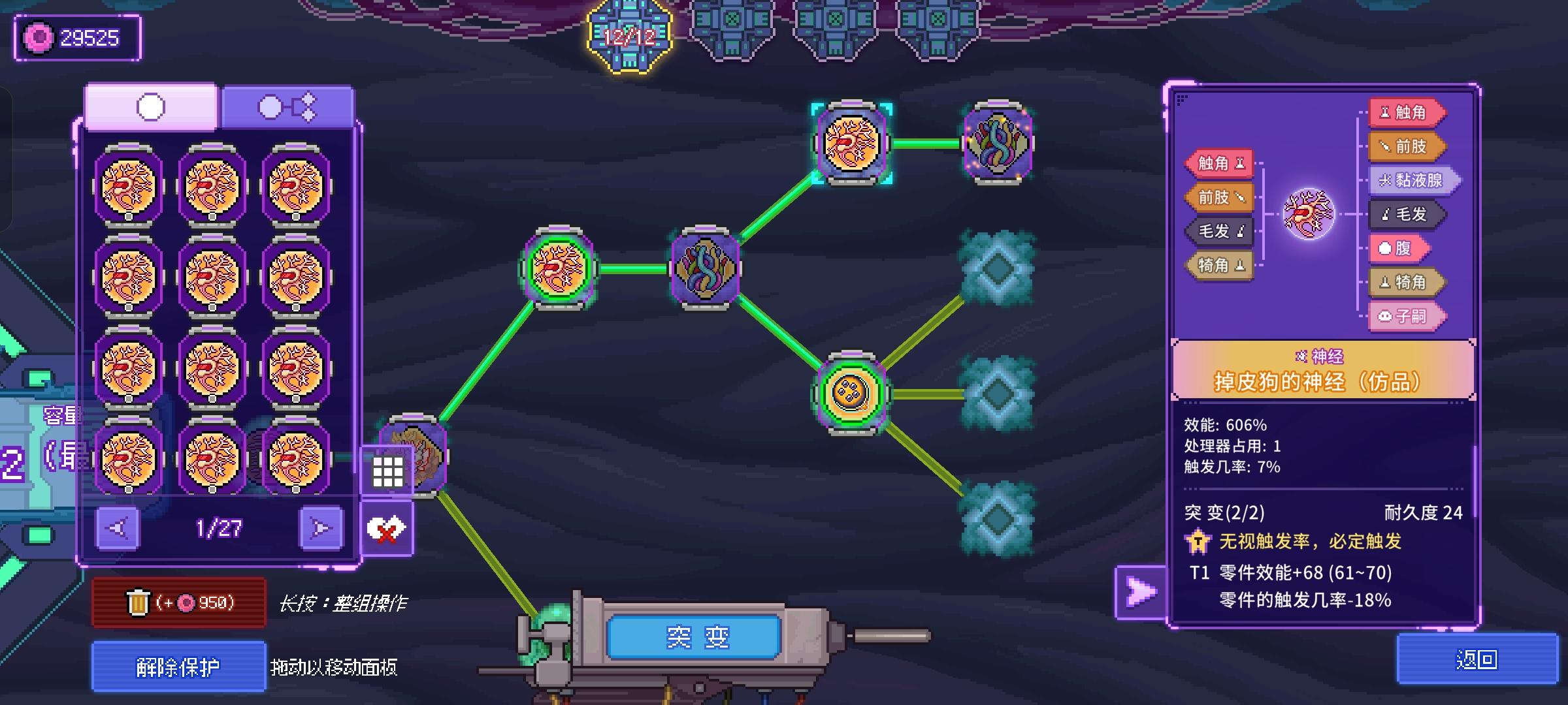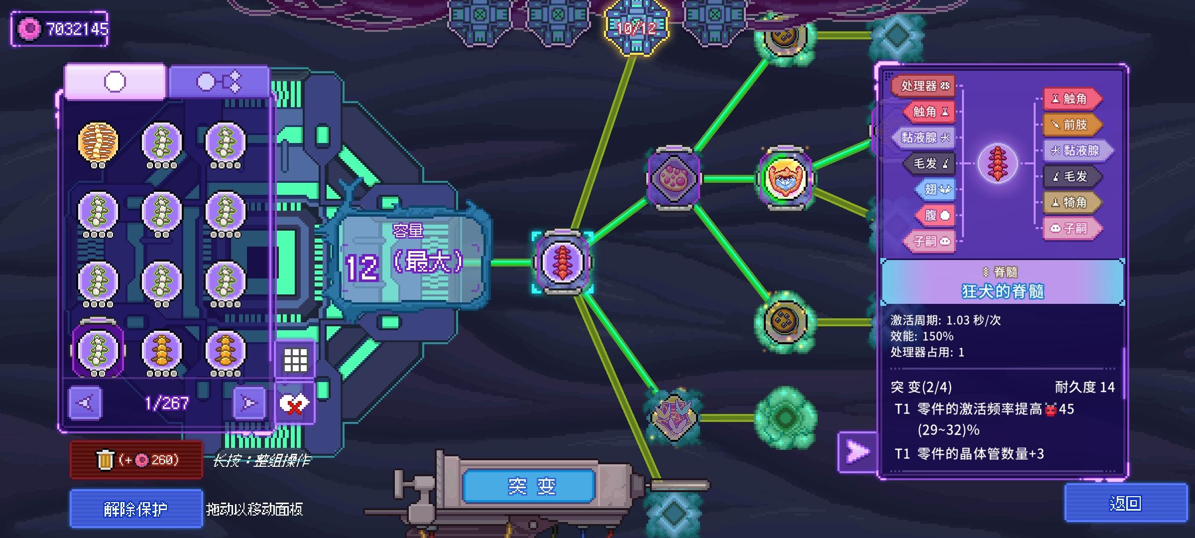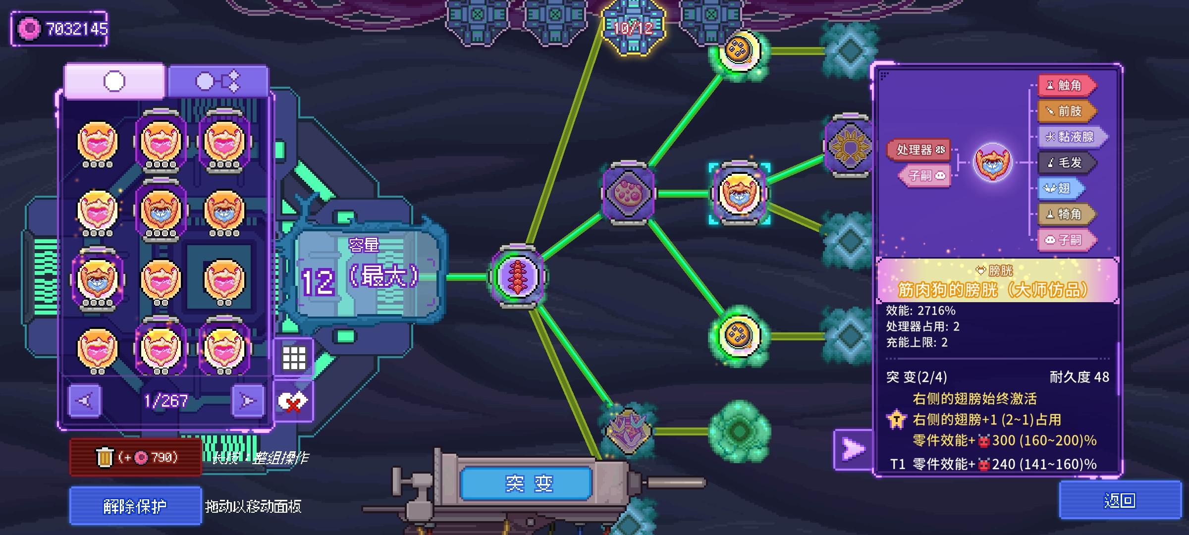 第一个脑就是主输出,第二个增加二次触发,第三和四个脑就用翅膀增加触发几率和增伤。其余脑就空置。用八爪鱼、胖头蛇、虚脑虫基因来加倍伤害。可惜还没研究到怎么回血,但是基本站着就能刷。由于伤害还不是很够,怪物75%减伤和加护盾还打不过。
