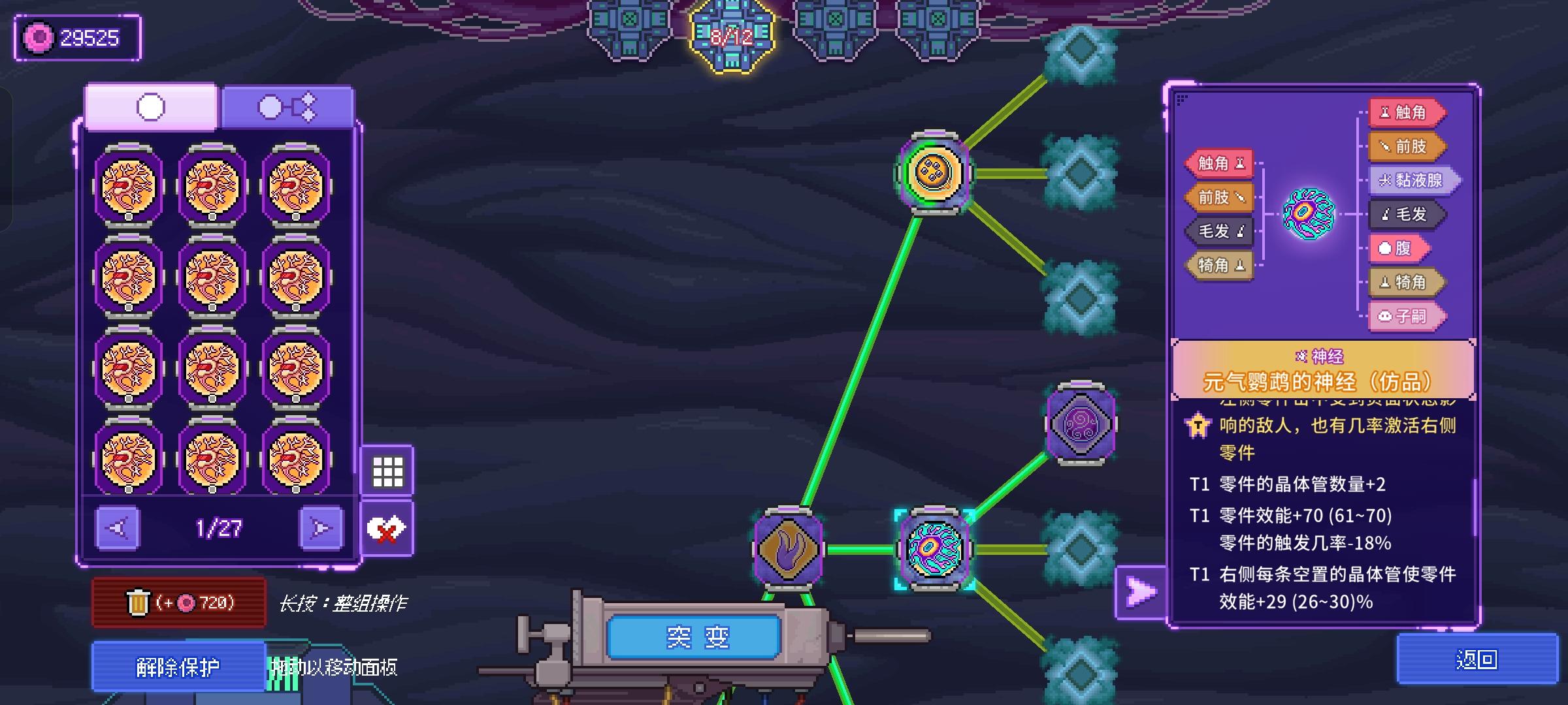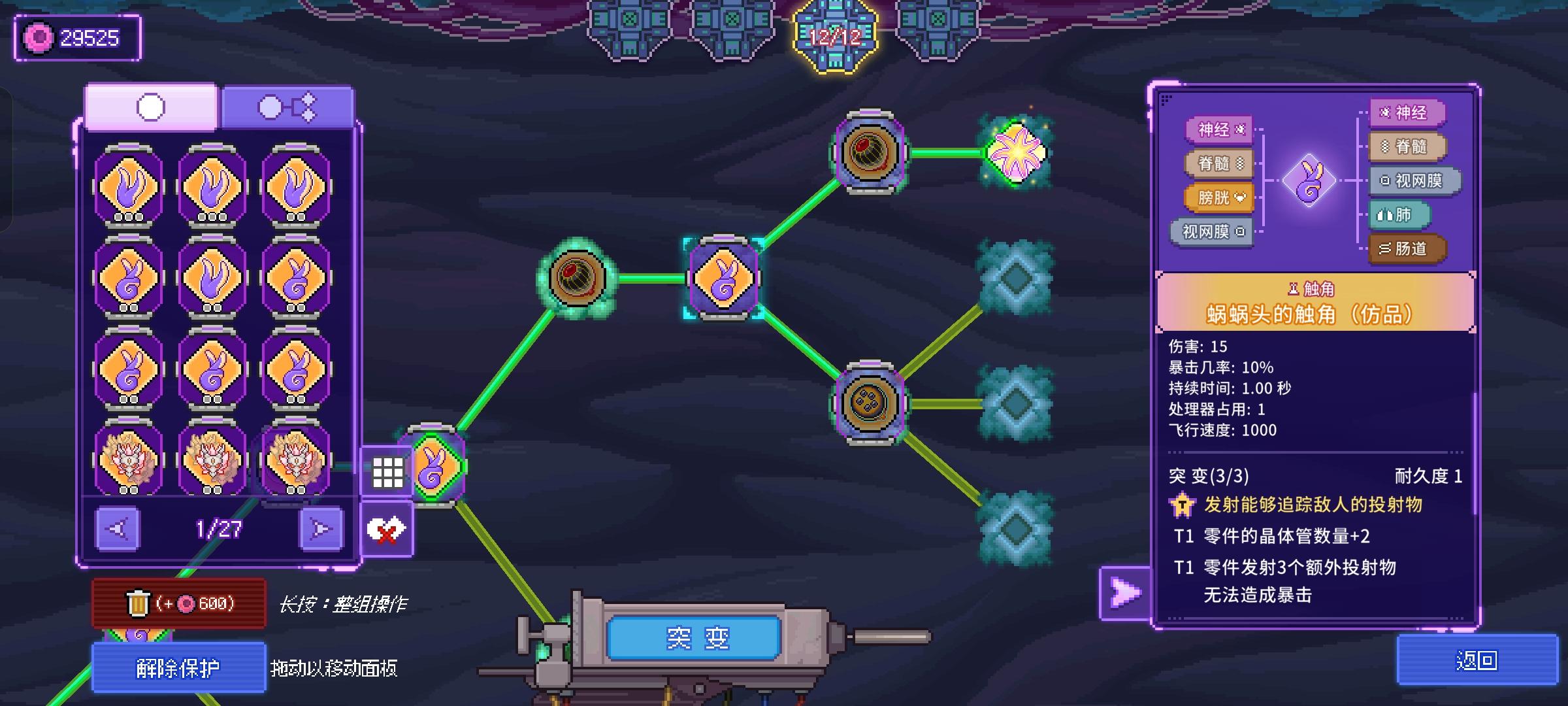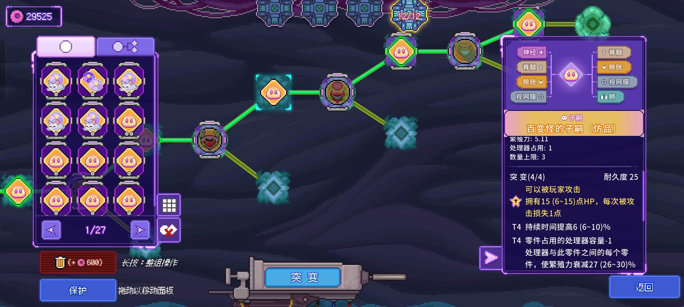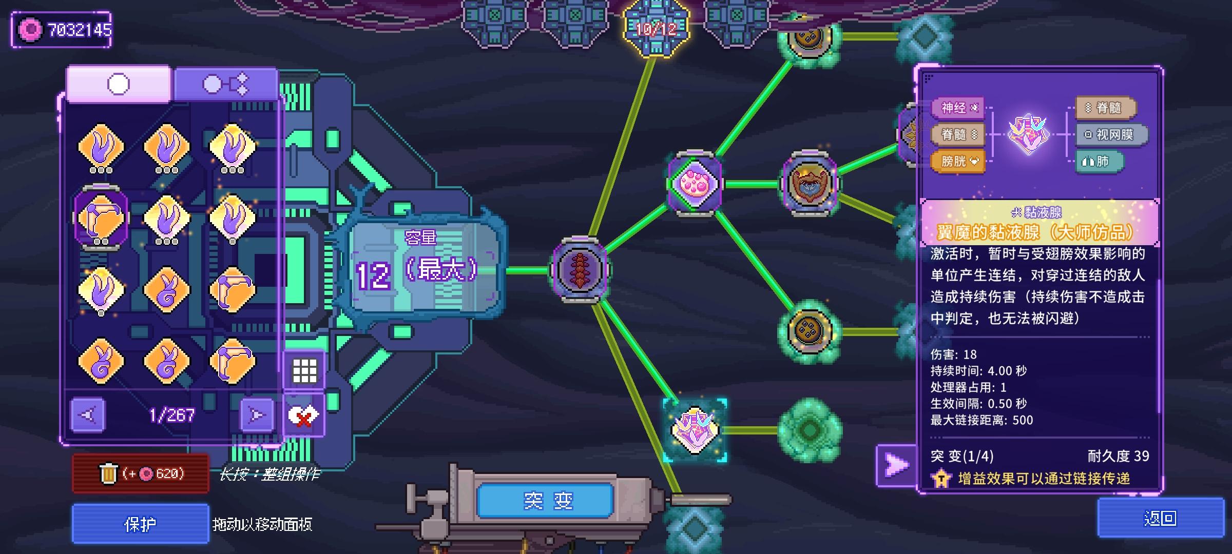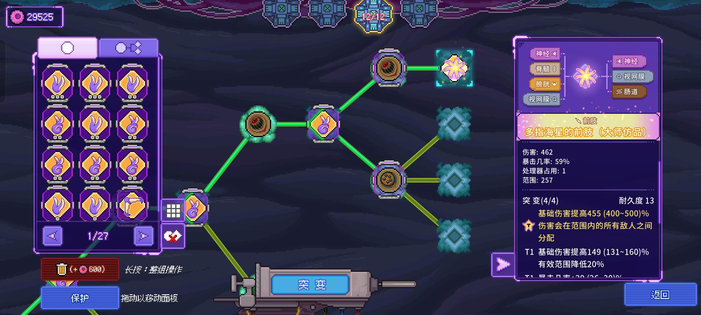 第一个脑就是主输出,第二个增加二次触发,第三和四个脑就用翅膀增加触发几率和增伤。其余脑就空置。用八爪鱼、胖头蛇、虚脑虫基因来加倍伤害。可惜还没研究到怎么回血,但是基本站着就能刷。由于伤害还不是很够,怪物75%减伤和加护盾还打不过。