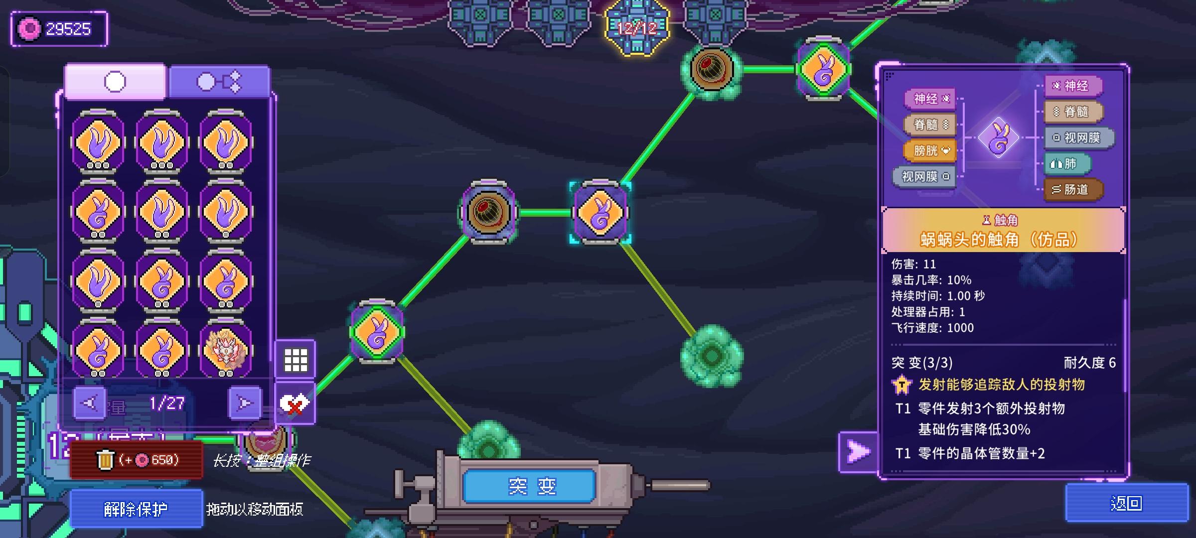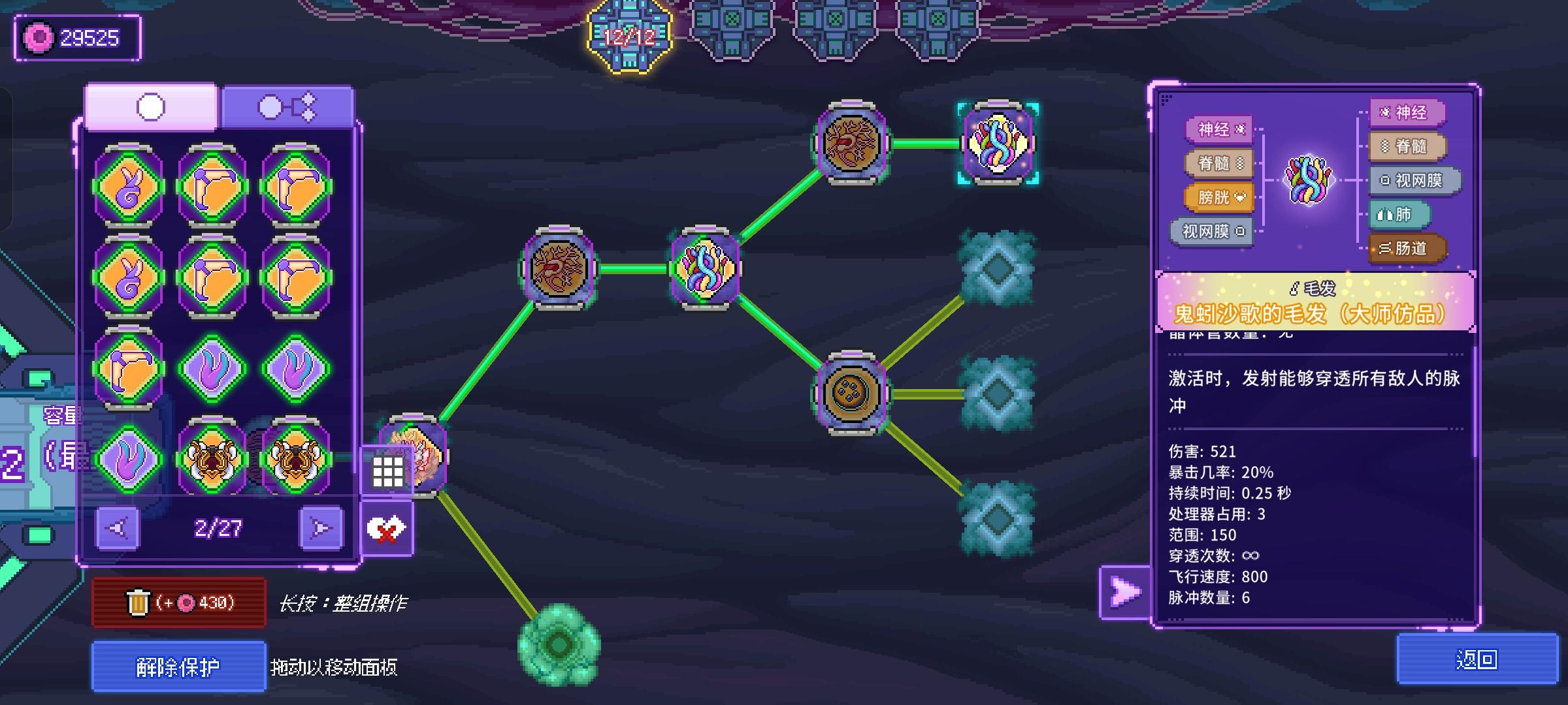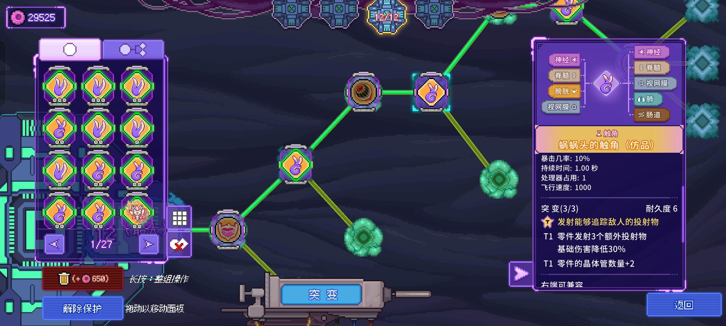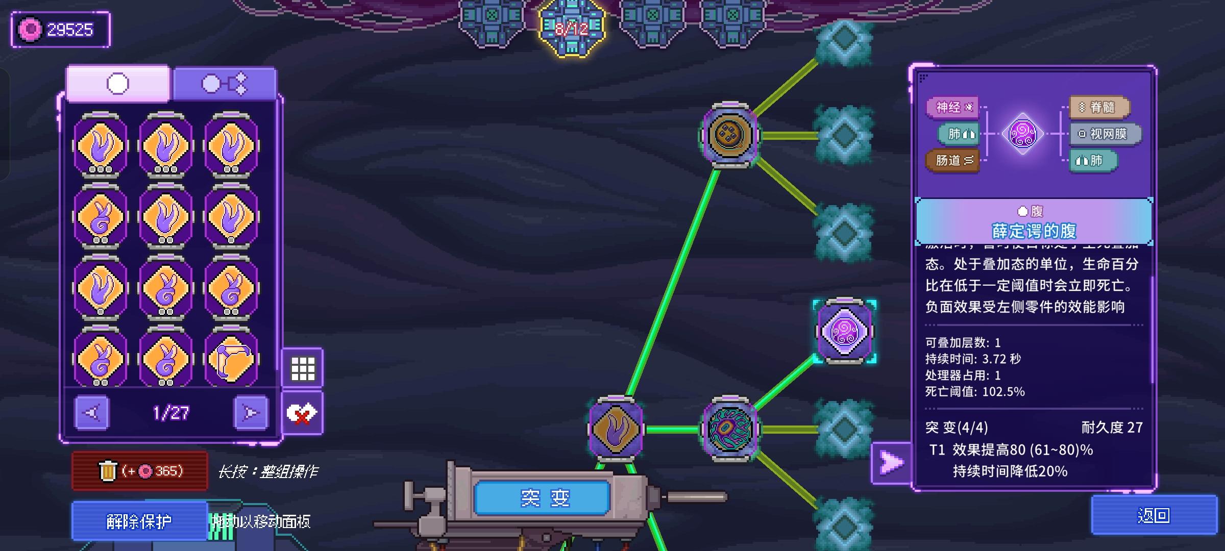 第一个脑就是主输出,第二个增加二次触发,第三和四个脑就用翅膀增加触发几率和增伤。其余脑就空置。用八爪鱼、胖头蛇、虚脑虫基因来加倍伤害。可惜还没研究到怎么回血,但是基本站着就能刷。由于伤害还不是很够,怪物75%减伤和加护盾还打不过。