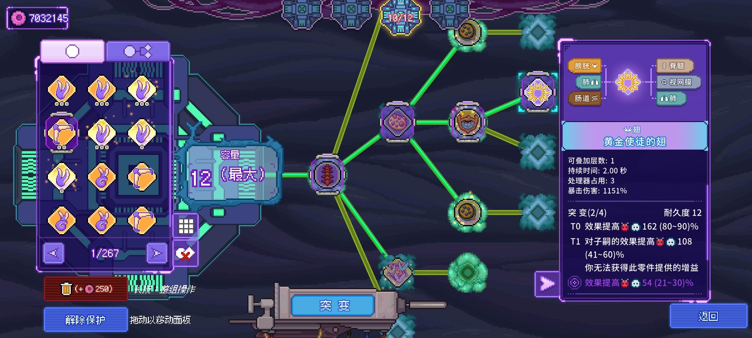 核心思路本套构建为筋肉狗的膀胱+石像鬼的翅+猎犬的视网膜+肉皇的肺+(魂蛆、电鼠丘、薛定谔)的腹,实现无视怪物护盾和减伤机制的恐怖杀伤力。筋肉狗的膀胱作为石像鬼的触发器,选择始终激活翅膀的仿品词条,其它词条看着来就行石像鬼的翅仿品词条和晶体管一共可以提供5个接口,配合4个猎犬的视网膜,可以让肉皇的肺效能提升1980%肉皇的肺由于取消了脊椎+窝窝头的触发,肉皇的肺选用加快激活频率的,可