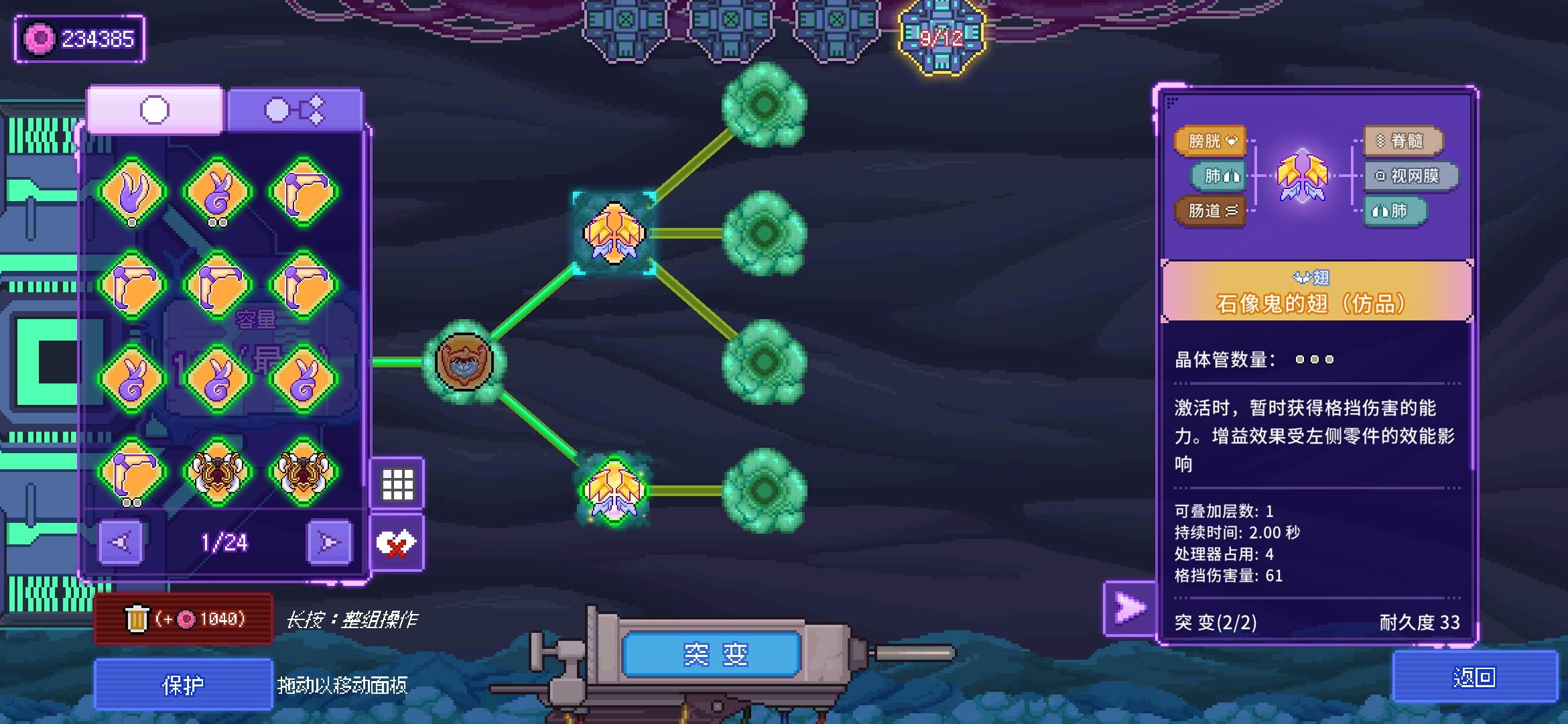 核心思路:基于第一代的几个优化方案,重新搭建的双处理器玩法:第一个处理器:石像鬼的翅+电鼠丘的腹+黄金使徒的翅,这个配置是绑定的:石像鬼的翅由于可以开通5个晶体管,猎犬的视网膜叠加的效能更高,必须留给伤害加成的器官,魂蛆的腹数值再高也只是计算加法,放到第二个处理器更合适,不过因为脑容量的问题,只能配置3个视网膜第二个处理器:花仙子的翅+魂蛆的腹+薛定谔的腹,两个腹放一个处理器,同时触发更保险